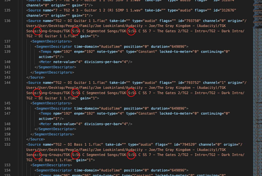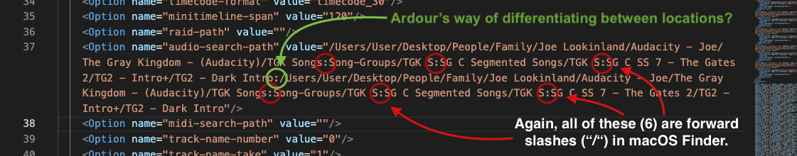... This issue keeps coming back to bite, so I spent about an hour just now trying to pinpoint the *exact* nature of it. The basic facts seem to be: 1. This all has to do with a colon (":") replacing any forward-slash ("/") that was present in a path or folder name. --> The colon (":") appears to be reserved in the XML to *differentiate between media locations*, so this trips-up a lot of things 'down the chain' (e.g. such as Session -> Properties -> Locations...). 2. Subsequent 'tainting' of "origin=" fields for any "<Source..." is then ALSO heavily problematic. --> Thanks to these colon(s) in the XML, *sources won't load*, and I ALWAYS end-up with a "Loading Error" window that prevents opening the session. 3. It occurred to me that this issue is absolutely related to bug 0009890 which I submitted early this year: https://tracker.ardour.org/view.php?id=9890 ---------- My task(s): 1. Better computer 'etiquette': DO NOT use slashes in directory or file names, even if allowed by macOS. -___- 2. Potential folder renaming/reorganization for use with Ardour 9. Your (?) task: : P 1. Either somehow account for the possibility of users using slashes/problematic symbols in directory names (and thus handle such situations in the XML differently(?)), or simply prevent users from using sources where the path includes slashes/problematic symbols. ---------- Thanks, -J [PS: I'm probably not the *only* dumb, macOS user that's used a slash in a folder name before. So I'd imagine this problem will eventually impact someone else... -But who knows?] |