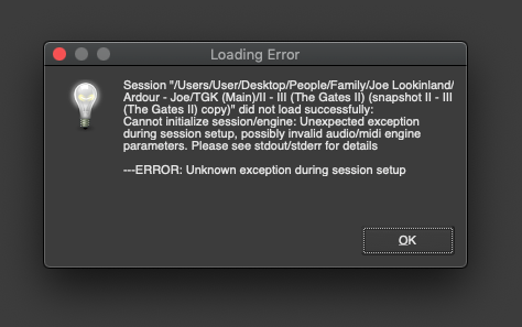 Update: I can also confirm that that example session loads for me fine on a Ubuntu VM I have. -BUT, I tried opening it on *2 other* macOS (Mojave) computers (-a MacBook Pro and Air), and both times it failed in precisely the same way (-see picture). I tried on these other computers because I thought that maybe some plugin-specific issue (or other specific thing) on my main Mojave machine (Mac Pro) was the culprit. This now appears to not be the case. It looks like this is an Ardour9-on-macOS (or at least Mojave (10.14.6)) issue. I have attached the stderr.log and stdout.log files from the MacBook Air, if they help. Thanks for any update on this. I'd be happy to provide more information/projects/tests/files/etc. if it helps! Thank you so much! -J stderr-2.log (1,183 bytes)