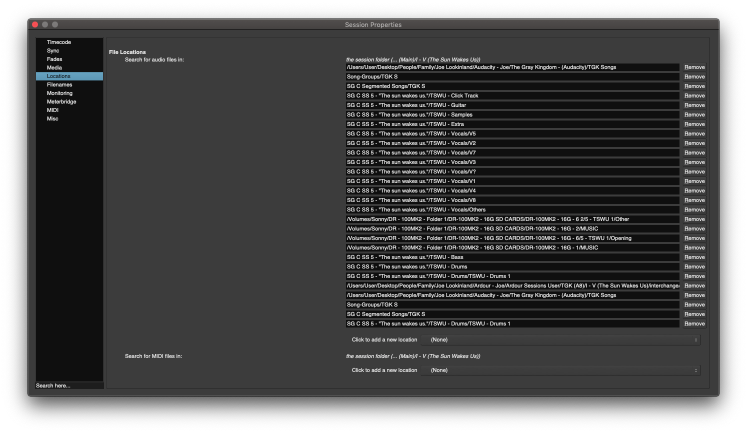 : O Well, as of 9.0.rc2.58, this appears to be "resolved"! The few projects I've tested so far are opening just fine. (!!!) Now, of course I'm still left with chaos like this (-see picture-) in Session -> Properties -> Locations... But that mess certainly does not impede my workflow. THANK YOU! : D ~Cheers, -J |