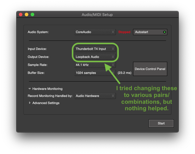 > CoreAudioPCM: device name query failed Does it work when you use a different backend? Either in a debug build you can directly use "Dummy" backend instead of "Coreaudio". In an optimized build you'd have to edit $HOME/Library/Preferences/Ardour9/config and while Ardour is not running add under Config <Option name="hide-dummy-backend" value="0"/> |