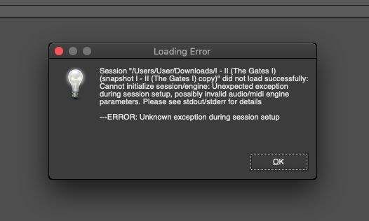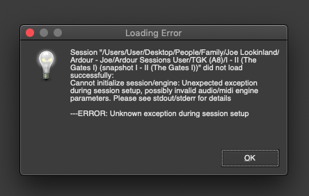 Update: I can also confirm that that example session loads for me fine on a Ubuntu VM I have. -BUT, I tried opening it on *2 other* macOS (Mojave) computers (-a MacBook Pro and Air), and both times it failed in precisely the same way (-see picture). I tried on these other computers because I thought that maybe some plugin-specific issue (or other specific thing) on my main Mojave machine (Mac Pro) was the culprit. This now appears to not be the case. It looks like this is an Ardour9-on-macOS (or at least Mojave (10.14.6)) issue. I have attached the stderr.log and stdout.log files from the MacBook Air, if they help. Thanks for any update on this. I'd be happy to provide more information/projects/tests/files/etc. if it helps! Thank you so much! -J stderr-2.log (1,183 bytes)