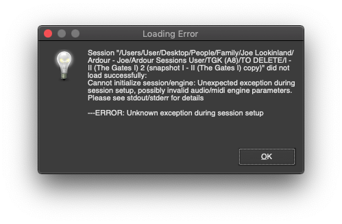 Okay, good to know! And thank you for continuing to have a look at this! Now, you have access to a full Apple hardware/software machine, yeah? Ditch whatever Linux you're using for a moment and try to open these two snapshots on *Apple/macOS* specifically: https://www.mediafire.com/file/xohre2y7yo2244o/Loading_Error_Test_5_NEW.zip/file I tested that session with x3 different Apple computers (x2 Mojave and x1 Monterey), and they ALL failed to load the "Loading Error Test 5 (WON'T Open).ardour" snapshot, with one computer (a slower MacBook Air) failing to load *both*. ... Also, another weird, related bug is happening this morning amongst all of this... Here's a 2.5min video I made demonstrating it: https://odysee.com/@icterine:a/Ardour-(pre9rc2,43)---Sources-with-Slashes-Issue-(1):4 TL;WW: I'm getting this popup after trying to create a track after importing a file from a path with slashes in the folder names: "There are insufficient ports available to create a new track or bus. You should save Ardour, exit and restart with more ports." O_____o ??? Hmm..... |