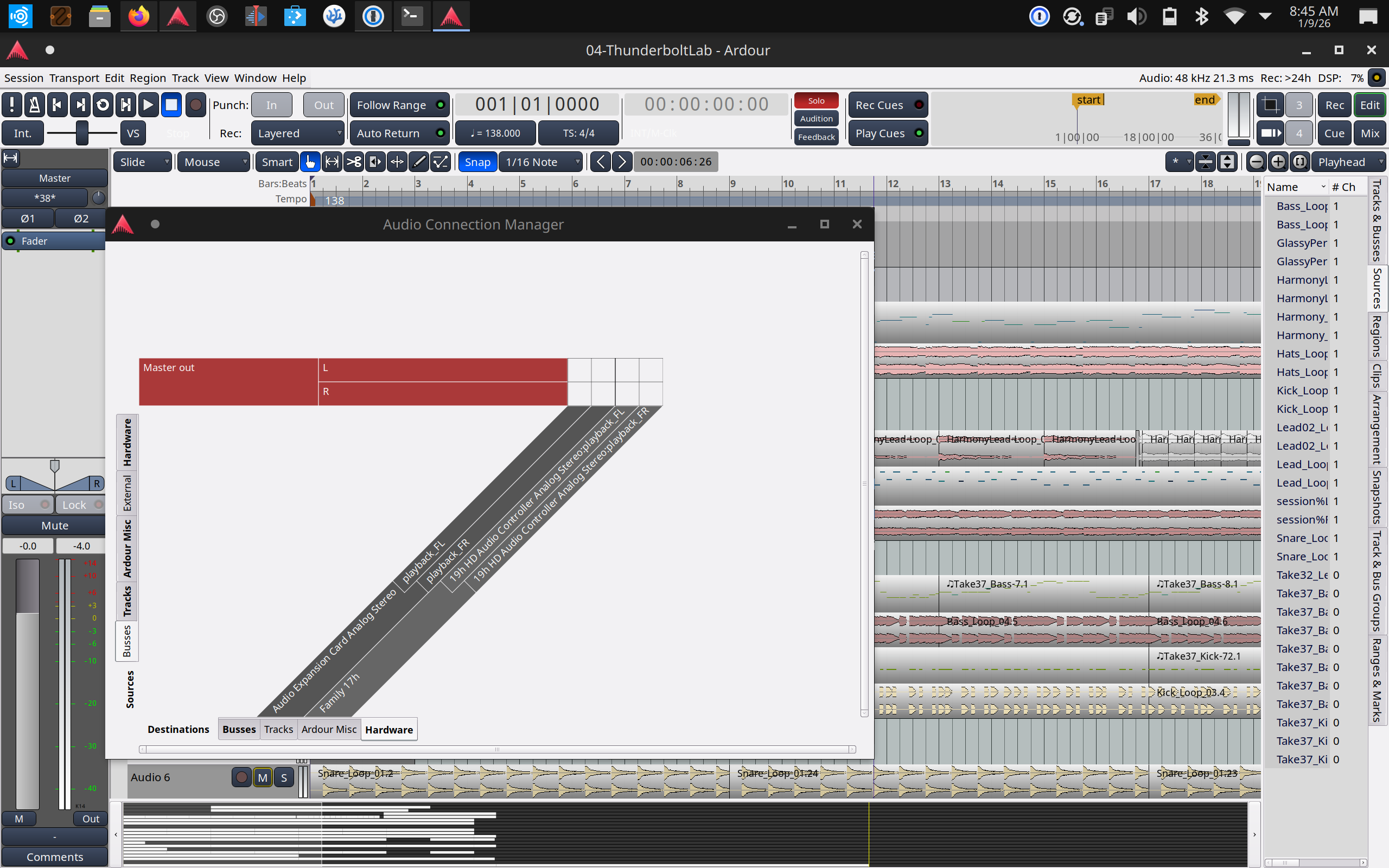 | Description | I have just switched to Ardour 8.12 on Ubuntu Studio 24.04.3 LTS on a Framework Laptop 16 with Ryzen™ 7 7840HS mainboard. It has both internal speakers, and headphones via one of the USB-C Aux Framework modules. I have several projects that I created with Ardour 8.12 on Ubuntu Studio 24.04.3 LTS and on Linux Mint on my old HP laptop. When I go to open these projects on the new Framework laptop, no audio comes out while connected to Jack. I discovered that in the Audio Connections (specifically in the Busses section) aren't automatically connected. Once I connect them to the audio hardware listed it works fine. However, without saving the project, they are not retained. When I did save and overwrite one of the old projects with the audio connections now connected, the project now crashes Ardour on launch. A brand new project on this laptop does auto-connect to hardware properly, and saving and reloading keeps the connections. So it appears to only be the projects that were created and saved on a different laptop, with different audio hardware. I would imagine this is a pretty niche issue, however I wanted to flag in case it was seen under other conditions too. | ||||