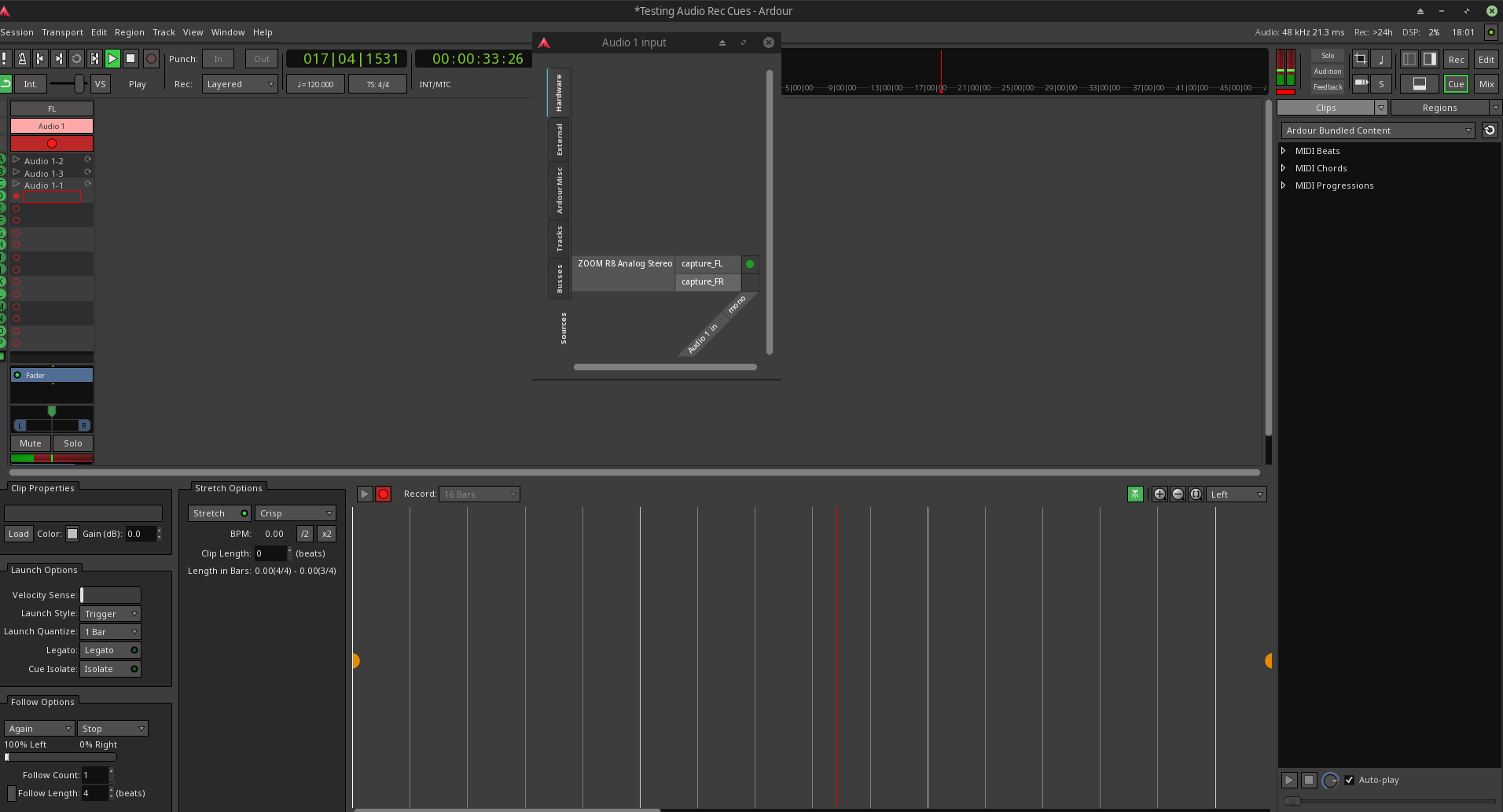 | Description | Cue page crashes when recording audio. Typically when recording length is Record Until Stopped, or greater than 16 bars. Tried recording electric bass through usb audio interface, and recording external audio from Firefox. Adjusted routing as needed for this. Crashed in both scenarios. Not sure if Stretch needs to be off, but one time the bass did come out sounding like the Stretch was slowing it down (and crashed). That said, this oddity only occurred once with the bass. Did not hear stretching on the external audio, even though I left stretch on the whole time. | ||||