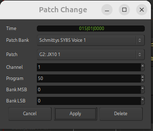 | Description | Double clicking on patch change in MIDI track opens a dialog. The dialog has the option to delete the patch. Deleting the patch does not work. | ||||