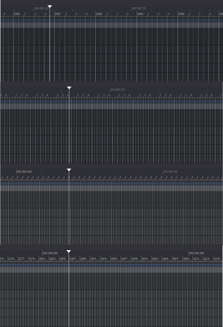 | Description | In Ardour on the "bars:beats" ruler when zooming at certain zoom extents there is not enough place to display both bars and beats. Since bars are more important then beats, Ardour should always give precedence to bars over beats. However in Ardour9 it seems that at certain zoom extents unlogically the beats get visibility precedence over the bars. This makes it difficult to see on which bar the playhead is playing. I've attached 4 screenshots at 4 different zoom levels (gradually zooming out from top to bottom). In the middle two screenshots you can see that respectively beats 2-4 and beats 2-3-4 are repeatedly shown, but the actual bar numbers are not visible. | ||||