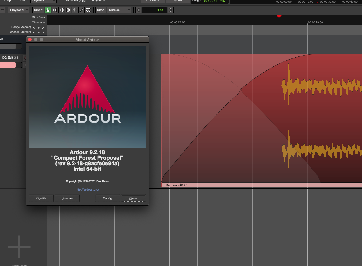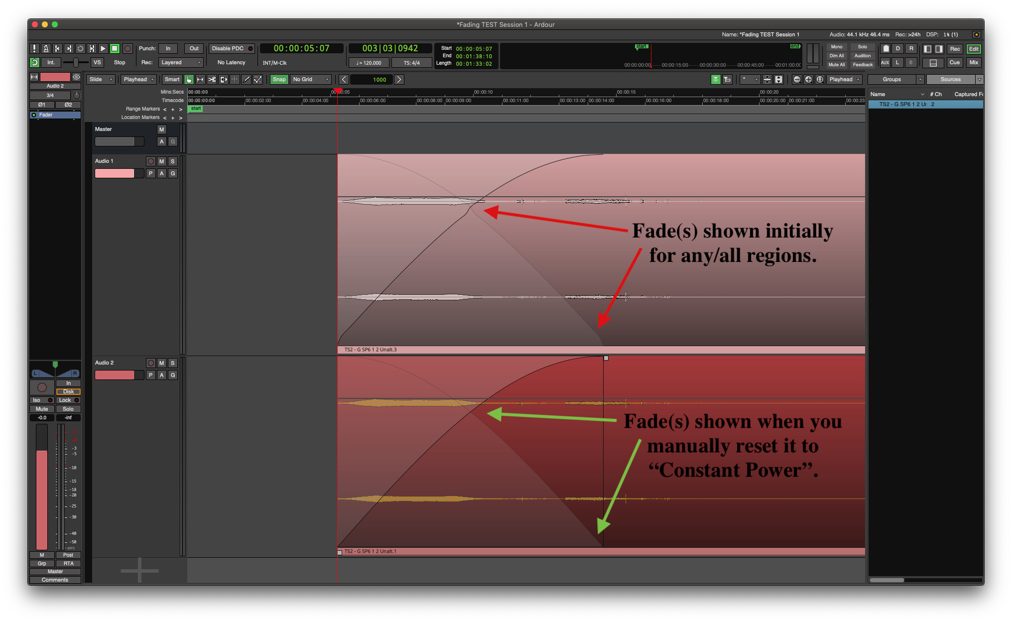 | Description | Not sure if you guys know about this, but the *visual representation* for region fades is initially wrong, consistently. Based on XML examination, I don't think this is affecting the *actual* audio-processing fade shape. -Just the visual representation of it. I.E. lists of numbers like this seem to stay the same before and after manually resetting the corresponding fade to "Constant power": <FadeIn> <AutomationList automation-id="fadein" id="711" interpolation-style="Curved" time-domain="AudioTime" state="Off"> <events>a0 1.0000000116860974e-07 a41053400 0.047581917240722742 a123160200 0.095056046128510166 a205267000 0.14231484248572931 a287373800 0.18925124993221623 a369480600 0.23575894240242462 a451587400 0.28173256500817656 a533694200 0.32706797270138427 a615801000 0.37166246619609461 a697907800 0.41541502461541735 a780014600 0.45822653433631649 a862121400 0.50000001351385825 a944228200 0.54064083177629574 a1026335000 0.5800569245933096 a1108441800 0.6181590018317934 a1190548600 0.65486075002673527 a1272655400 0.69007902790898956 a1313708800 0.72373402244207363 a1395815600 0.75574959107584527 a1477922400 0.78605314034223239 a1560029200 0.81457596850756175 a1642136000 0.84125352362782713 a1724242800 0.86602541938889765 a1806349600 0.88883548505684096 a1888456400 0.90963200949777623 a1970563200 0.92836792879818764 a2052670000 0.94500083077800312 a2134776800 0.95949299759422635 a2216883600 0.97181157768799009 a2298990400 0.98192869618882905 a2381097200 0.98982144793751214 a2463204000 0.99547193120317901 a2627417600 1 </events> | ||||
