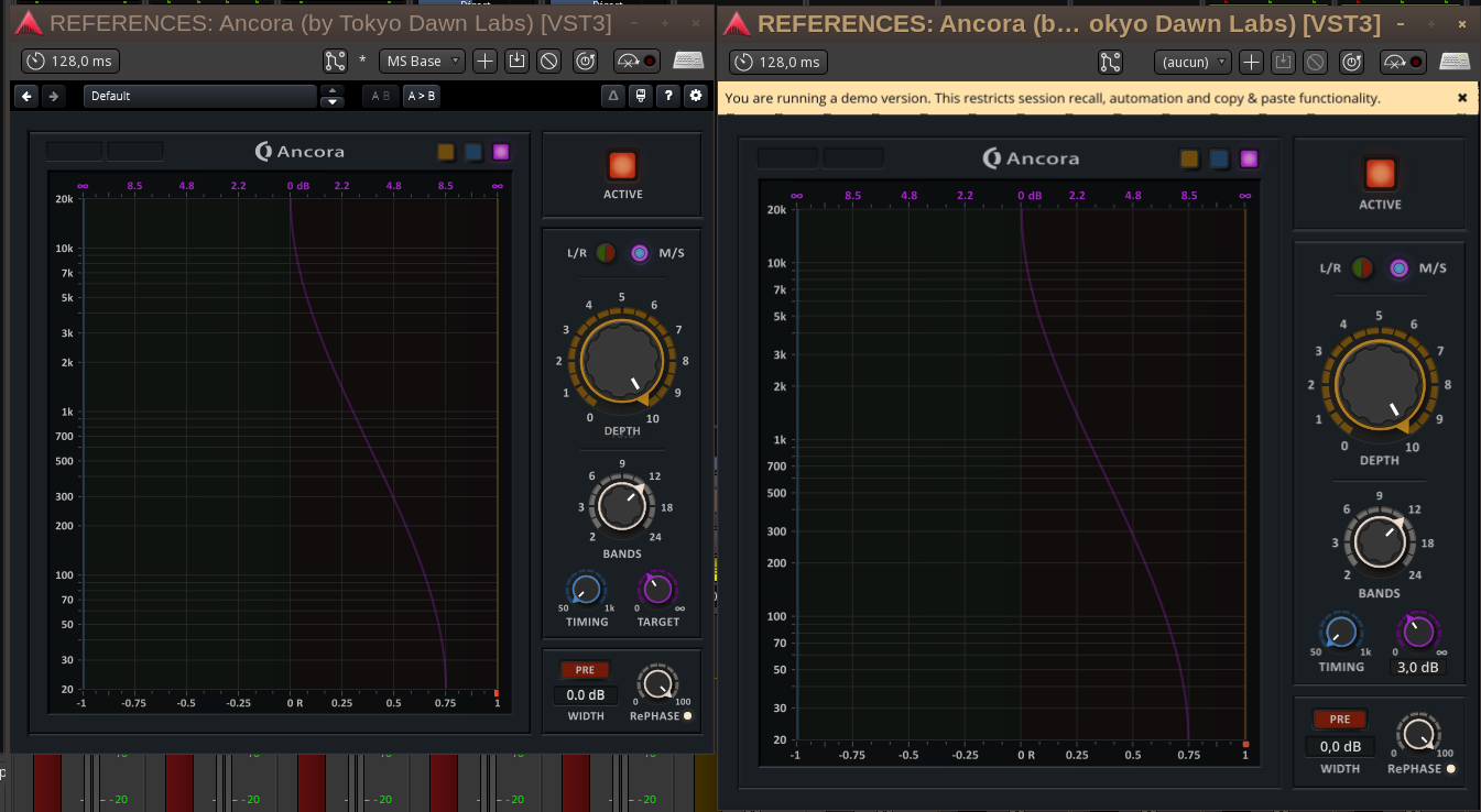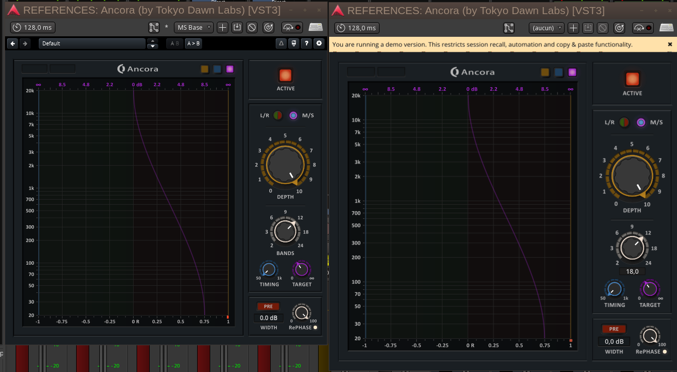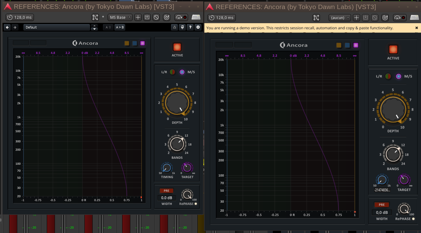 | Additional Information | On the attached screenshots, on the left is the plugin running through WINE/Yabridge, on the right the native Linux VST3, both with the exact same settings. - As seen on the Ancora_Linux-beta2_Bands.png, the number of bands per octave is displayed as 18 in the Linux version, when it should be 12. The “Bands” section almost always displays an incorrect value in the Linux version. At the minimum setting, it displays “-nan” instead of “2.0”. If I type “12” on the keyboard, it displays “6” in the knob's GUI. If I type “18”, it displays “12”. If I type “21”, it displays “18”. However, if I type “24,” it displays “24.” - As seen on Ancora_Linux-beta2_Target.png, the "Target" value displayed is 3 in the Linux version when it's 3.5 in the Win version. In any case, it is always displayed with a slight discrepancy from the value assumed to be correct, regardless of what that value is. - As seen on Ancora_Linux-beta2_Timing.png, The “Timing” value displayed is -2147483648. The "Timing" parameter is actually set on 50ms and is shown properly on the Win version when the parameter is highlighted with the mouse cursor. All the values above 50ms are displayed wrongly on the Linux version, for instance if i enter "250 ms" the line on the GUI is shown closer to 50 ms than 250 ms, same on the knob. - The same settings are displayed as well with the same wrong values in the generic UI. - The same Linux VST3 plugins work perfectly and as expected with Reaper and Bitwig, BUT just as poorly with Qtractor. | ||||