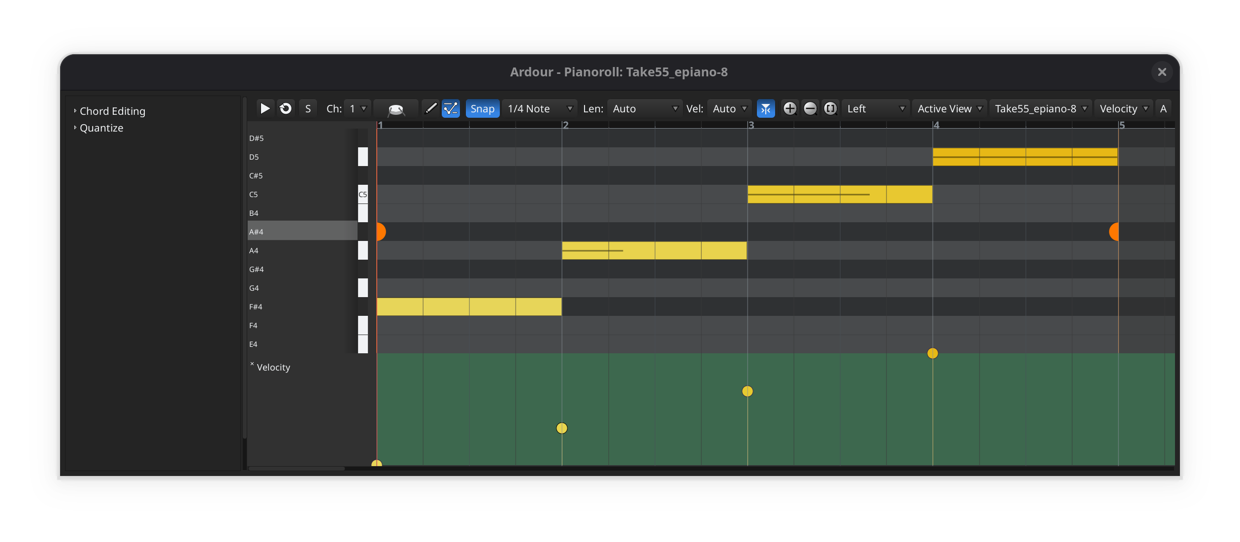 | Description | The saturation range used in the Velocity color scheme for notes is not wide enough. Here is a quick demo that displays how 0000010:0000040 units of difference between two middle notes is hard to distinguish, although that represents 1/3 of the possible velocity range. | ||||