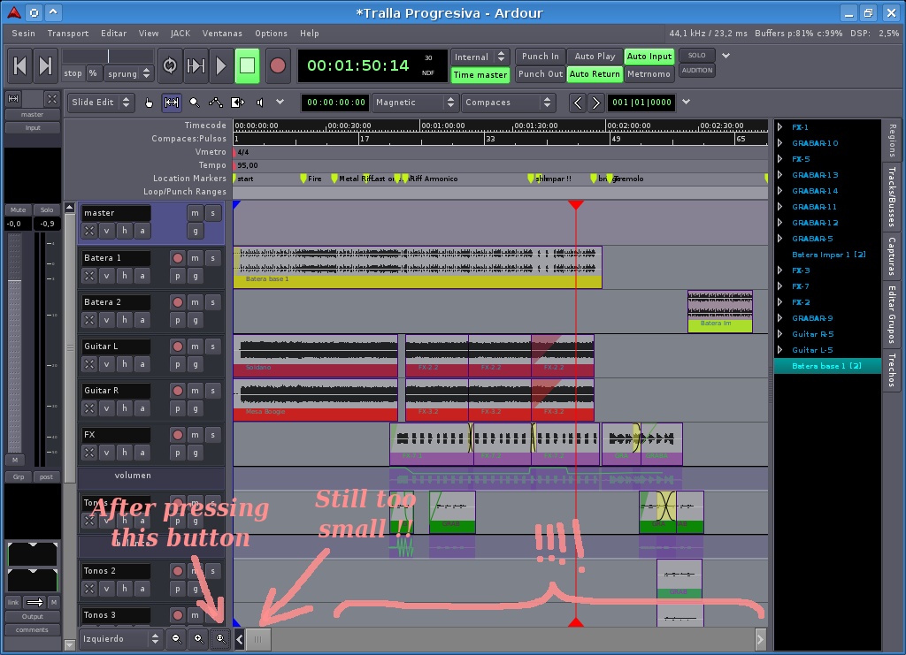 When zooming out and in *WITH CTRL+MOUSE WEEL* instead of the buttons, the scroll bar dowsn't recover it's original size, and stands too small. Pressing [all session view] button don't make the scroll bar recover it's original size, just restarting Ardour2 -----> SEE SCREENSHOT !! |