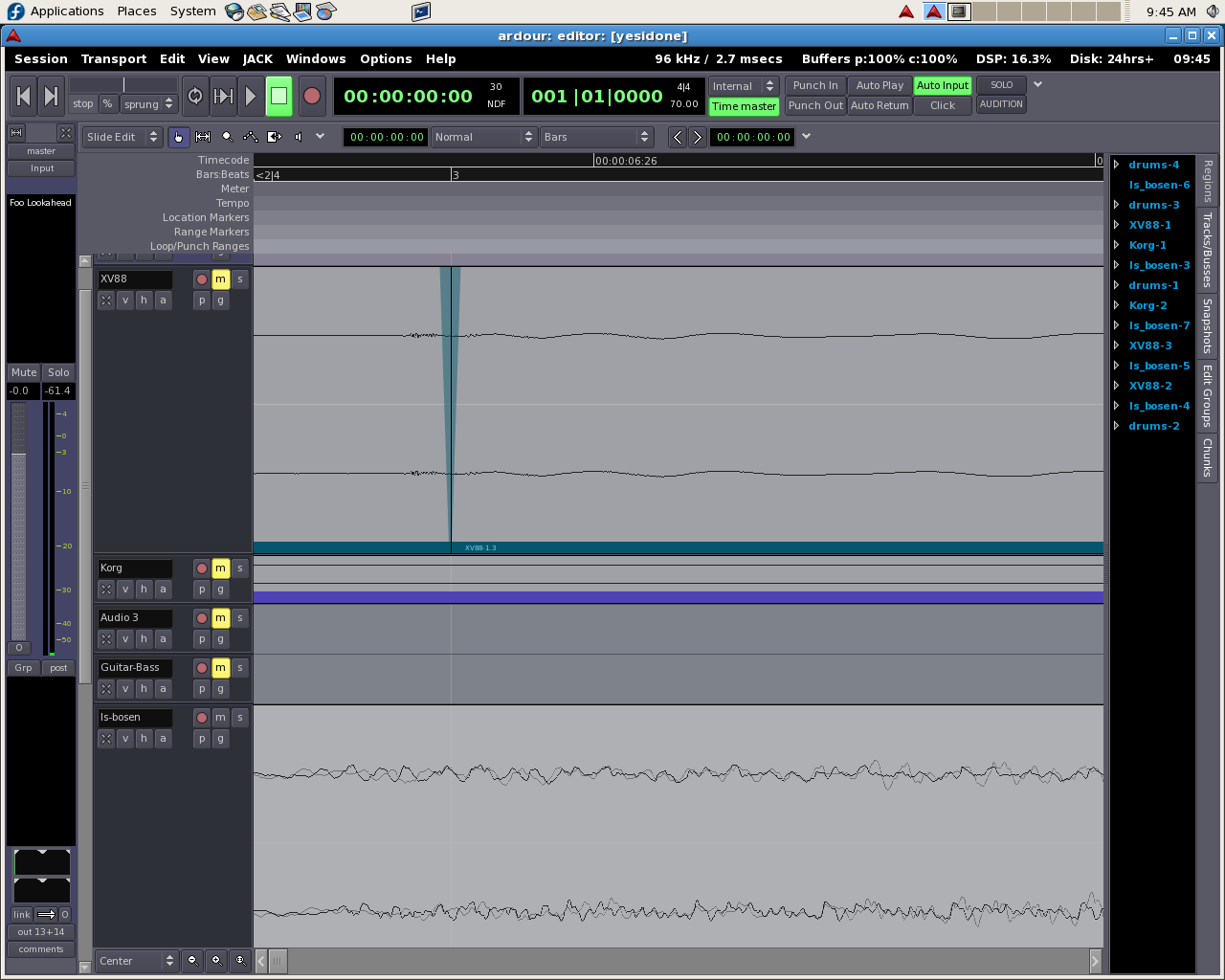 Well... once... I swear... I saw the audio move back to where it belonged via twiddling with JACK->latency->XXX - but I have twiddled with it and still can't move rosegarden's output back behind the beat marker where it belongs. Also, it JACK->latency seems to be reset to 32 on every load of a file with the template I'm using. Ignore this. With a new template it seems to work. (11:04:46 AM) mtaht5: OK, so I finally got it closer to doing the right thing... (11:06:14 AM) mtaht5: jack is set to: 96khz, 2 periods, 256 frames/period (11:06:53 AM) mtaht5: Ardour is now set to 96khz, JACK->Latency = 512, which appears to move the rosegarden generated audio to about 128 samples behind the beat. (11:07:09 AM) mtaht5: so I'm going to try everything setup at 512... (11:07:10 AM) mtaht5: brb (11:08:45 AM) SpeS left the room (quit: Remote closed the connection). (11:11:53 AM) mtaht5: nope. Made being ahead of the beat worse. (11:13:12 AM) mtaht5: changed to 512 frames/period in jack, JACK->latency of 512 = rosegarden's audio is now ~ 690 samples ahead of the beat. (11:15:58 AM) mtaht5: possible that last datum was closer to 965 So I moved to 1024 samples/period in jack and Ardour's JACK->latency is also 1024. rosegarden is now roughly 1710 samples ahead of the beat. |