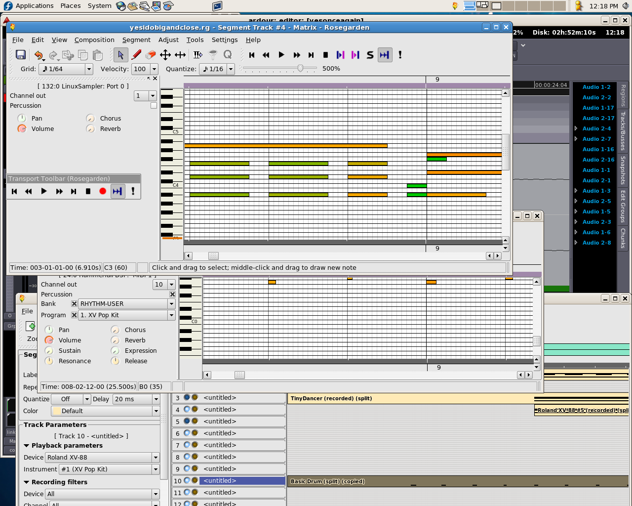 Screenshots 4 and 5 demonstrate the problem. The closest I've been able to get to something reasonably closely synced so far has been: Jack set to 1024 samples/period. 2 periods Ardour set to same. Rosegarden delaying the midi drum track 20ms and keeping the linuxsampler piano at 0 ms (both tracks are quantised to start on the beat, however!) |