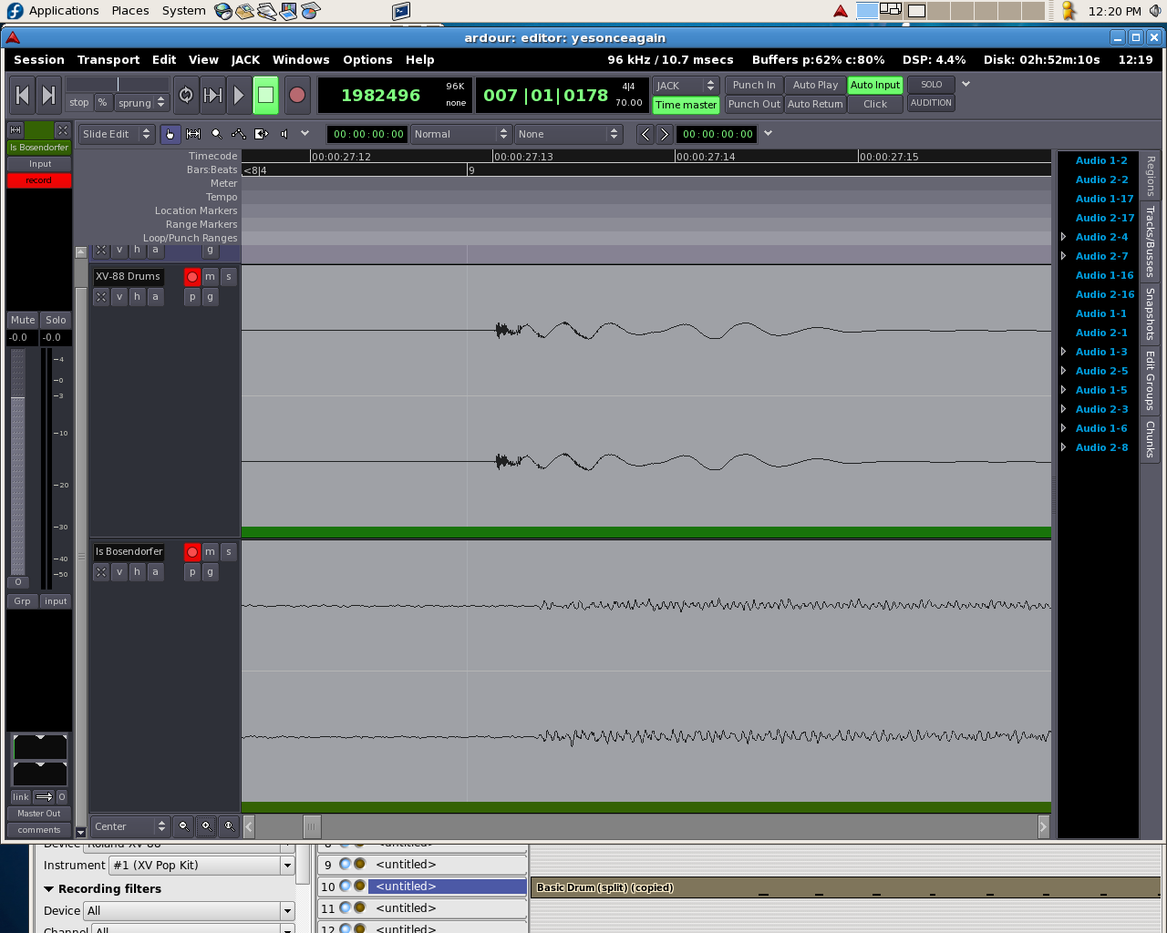 | Description | I did some extensive testing with surfaces head and rosegarden 1.5 the other night. It used to be that a typical rosegarden generated drum track would lag the actual beat by X. Which was OK, and expected of midi devices, and still editable in ardour. Now, somehow - it seems to be leading the beat by a few ms, which makes editing the results kind of painful. The only thing I can remember doing different on this recording was that I do have an amp plugin enabled, but that shouldn't make a difference, should it? I will try raw. For now the workaround appears to be to tell rosegarden to arbitrarily delay midi for it's recorded output by 10ms, but that kind of impacts live performance. Uploading a screenshot and rg file the demonstrates the problem | ||||