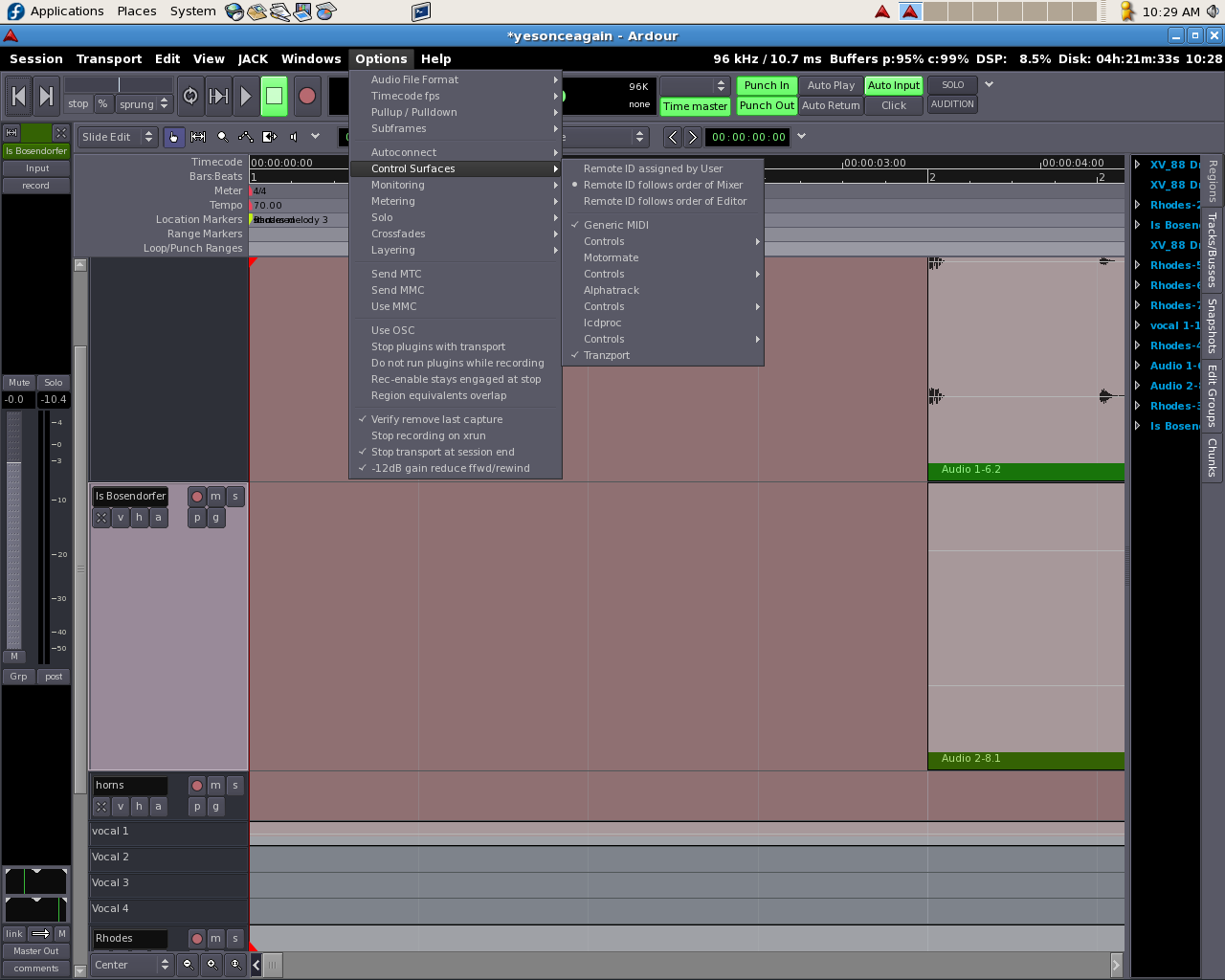 | Description | to me it would make more sense for the surfaces menu instead of looking like this: Remote id assigned by user Remote id follows order of mixer Remote id follows order of editor Mackie Controls Tranzport Controls Alphatrack Controls -- to look more like this with submenus Mackie -> [checkbox] Enable [checkbox] Feedback [checkbox] Snap-to slave [checkbox] Follow selected track Tranzport-> same as above Etc. The first two changes are merely changing how the menu is created in build_control_surface_menu. (as I envision a dozen or more additions to the surfaces support, the menu gets kind of long otherwise. Also, "controls" where it is is confusing. The 2nd two ideas are extensions to the control protocol that seem to have fallen out of actually working with the mackie and alphatrack. The first extension is the idea that a shuttle wheel COULD be set to follow the default snap-to increment and be a far more useful thing. The second extension, is if you have a device with a limited number of faders (like - 1), enabling "follow selected track would tell the device to select that track when the user selects that track, making integration of mouse and surface editing more intuitive. Last idea: as it is possible that someone will have multiple devices the probe routine could report back multiples of each surface and the menu show: "Tranzport 0000001 Tranzport #2 etc some sort of unique number would have to also be associated with the device (in the case of usb, the manufacturer id + the serial number would suffice) and have to be mapped to it on some consistent basis. | ||||
