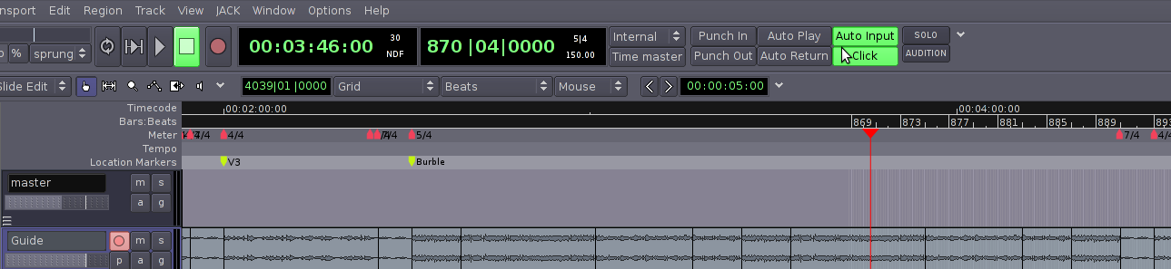 I've just have another session (new, from scratch in 2.7.1, currently rev 4422) get totally spaced out by this bug. Three hours of carefully measured and placed time changes suddenly gone AWOL. :( I've had a look for the "zoom bug" but can't find the one you mean. I'm seeing a problem that if you're not zoomed (and perhaps anchored to the start of the session) then right clicking on the mark or meter bar registers the click somewhere off to the left. Is that what you're referring to? As for the time signature related stuff, it seems like something loses the plot and gets very confused about the meter. Bar numbers rocket (by a factor of about four at least sometimes) and the changes get scattered throughout the session. This: <Meter start="1|1|0" note-type="4.000000" beats-per-bar="4.000000" movable="no"/> <Meter start="17|1|0" note-type="4.000000" beats-per-bar="3.000000" movable="yes"/> <Meter start="19|1|0" note-type="4.000000" beats-per-bar="4.000000" movable="yes"/> <Meter start="20|1|0" note-type="4.000000" beats-per-bar="3.000000" movable="yes"/> <Meter start="21|1|0" note-type="4.000000" beats-per-bar="4.000000" movable="yes"/> <Meter start="22|1|0" note-type="4.000000" beats-per-bar="3.000000" movable="yes"/> Became this: movable="no"/> <Meter start="1|1|0" note-type="4.000000" beats-per-bar="4.000000" movable="no"/> <Meter start="17|1|0" note-type="4.000000" beats-per-bar="3.000000" movable="yes"/> <Meter start="41|1|0" note-type="4.000000" beats-per-bar="4.000000" movable="yes"/> <Meter start="60|1|0" note-type="4.000000" beats-per-bar="3.000000" movable="yes"/> <Meter start="86|1|0" note-type="4.000000" beats-per-bar="4.000000" movable="yes"/> <Meter start="107|1|0" note-type="4.000000" beats-per-bar="3.000000" movable="yes"/> Unfortunately I don't have a back up of any of the changes beyond that point. I'm attaching a screenshot attached showing a point in the session where things go weird (zooming to different levels affected this). And further to my comment about meter changes in the middle of a bar, they still seem more likely to cause the problem but even with snap-to-bar on I've managed to scramble the session a second time whilst writing this. Interestingly, the shifting of the meter changes is exactly the same so it's unlikely that it's related to anything like where I click or which meter change I'm moving and to where. This is really crippling my recording at the moment :( |