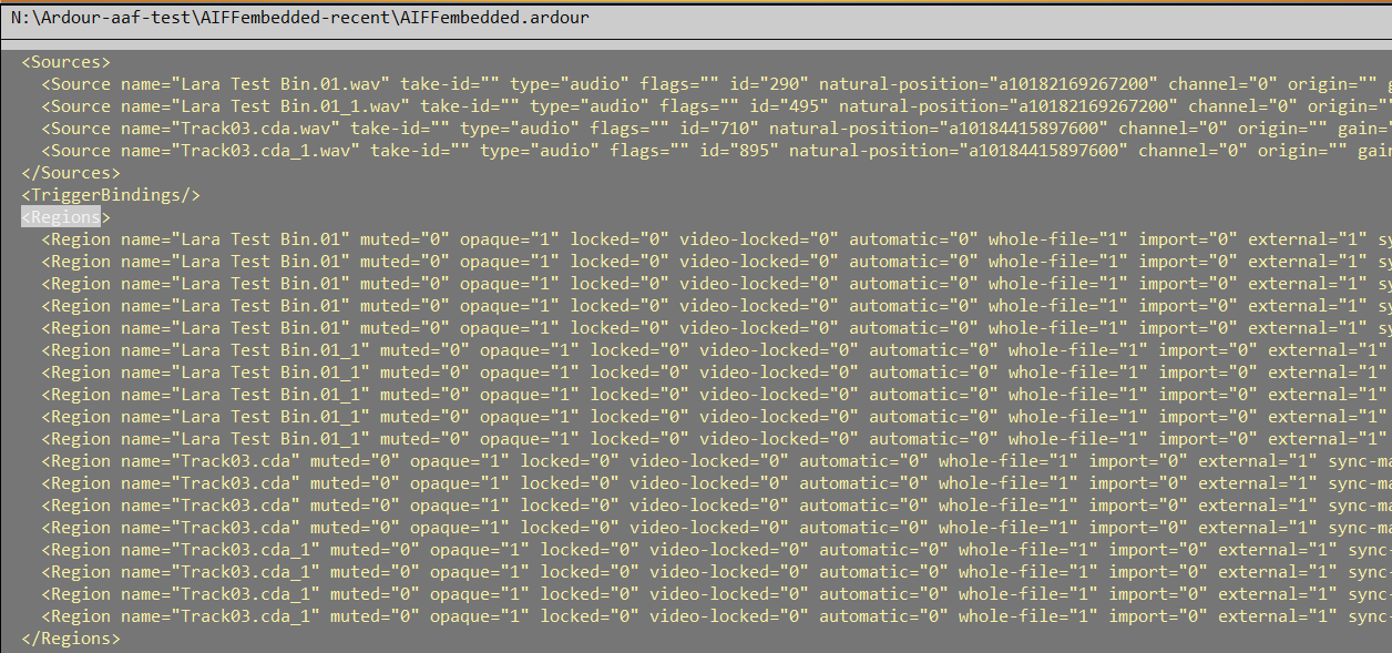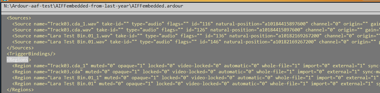 Ah, I see what you mean now... in fact looking at some of my '.ardour' files in a text editor I can see that the source filenames got added to the 'Sources' pane, yet also added to the 'Regions' pane for some reason. I'm wondering if this might be a problem with Ardour, rather than with the AAF importer because (internally) it seems to be the same with all of my '.ardour' files - and yet at runtime, not all of them show the same contents for both panes. Strange... |