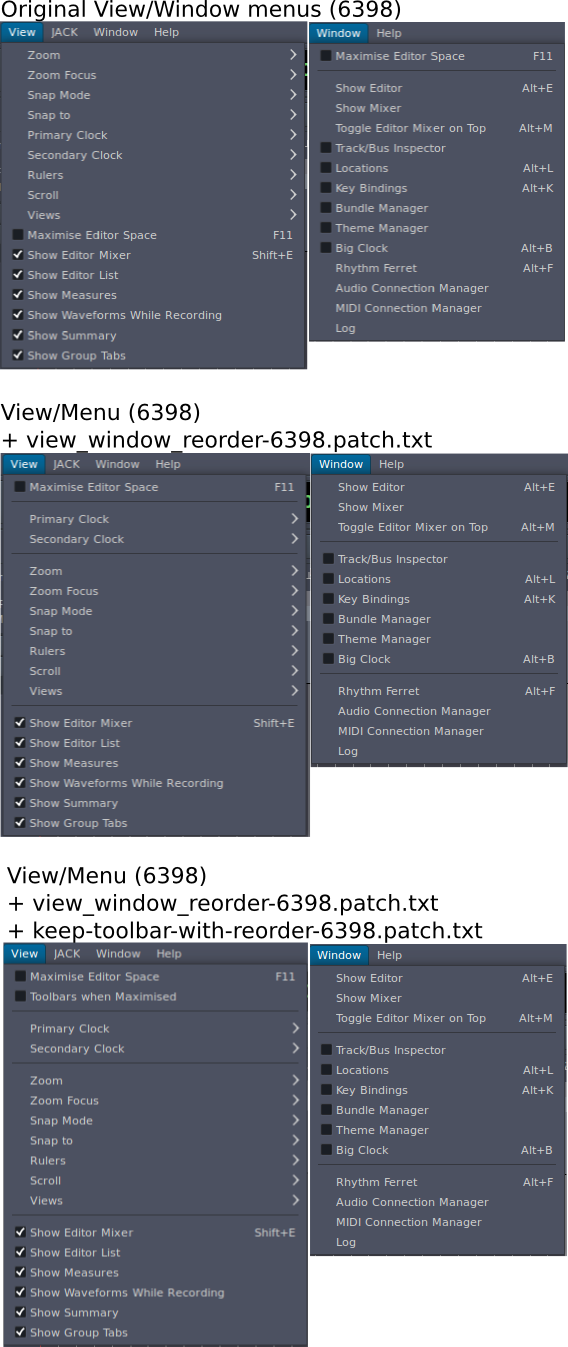 uploaded a long named (descriptive) updated version of the patches composited together... It keeps all three tearoffs and saves the setting with the project as a common option (option setting stays with a project), etc. keep-toolbar-with-some-menu-reorder-7463.patch.txt The menu layout was cleaned up a little bit and looks similar to the older PNG attached to this .. but the ALT-F Rhythem Ferret is in a new menu at this point in time (only real difference between then and now) plus added some dividers to help read/view-ability of the two menus (View and Window ) Hopefully this is usable as-is. |