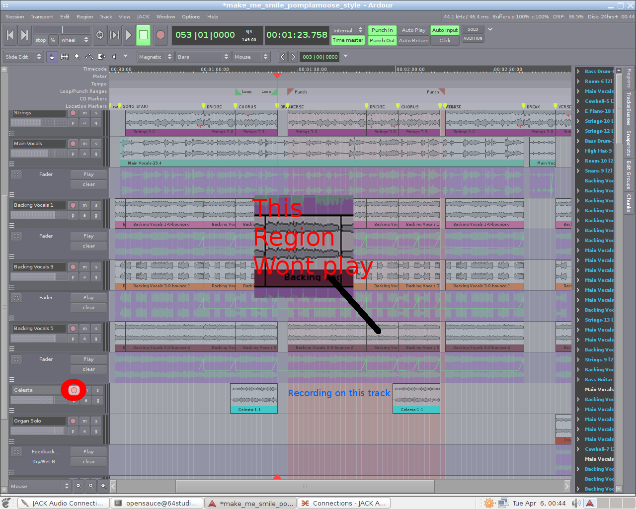 Yup. Okay so I have a track labelled cow bell. In this track there are lots of regions. Im calling the joins between these regions seams (like joins in material). Im recording a cymbal on a new track. During the duration of recording the cymbal there are many seams on the cowbell track. Ardour should play all the regions when im recording the cymbal. However at some of the seams (random) (the end of one region and the start of another) the cowbell track stops playing for the entire duration of that region. Its random tracks and random seams. Thanks, Chris. |