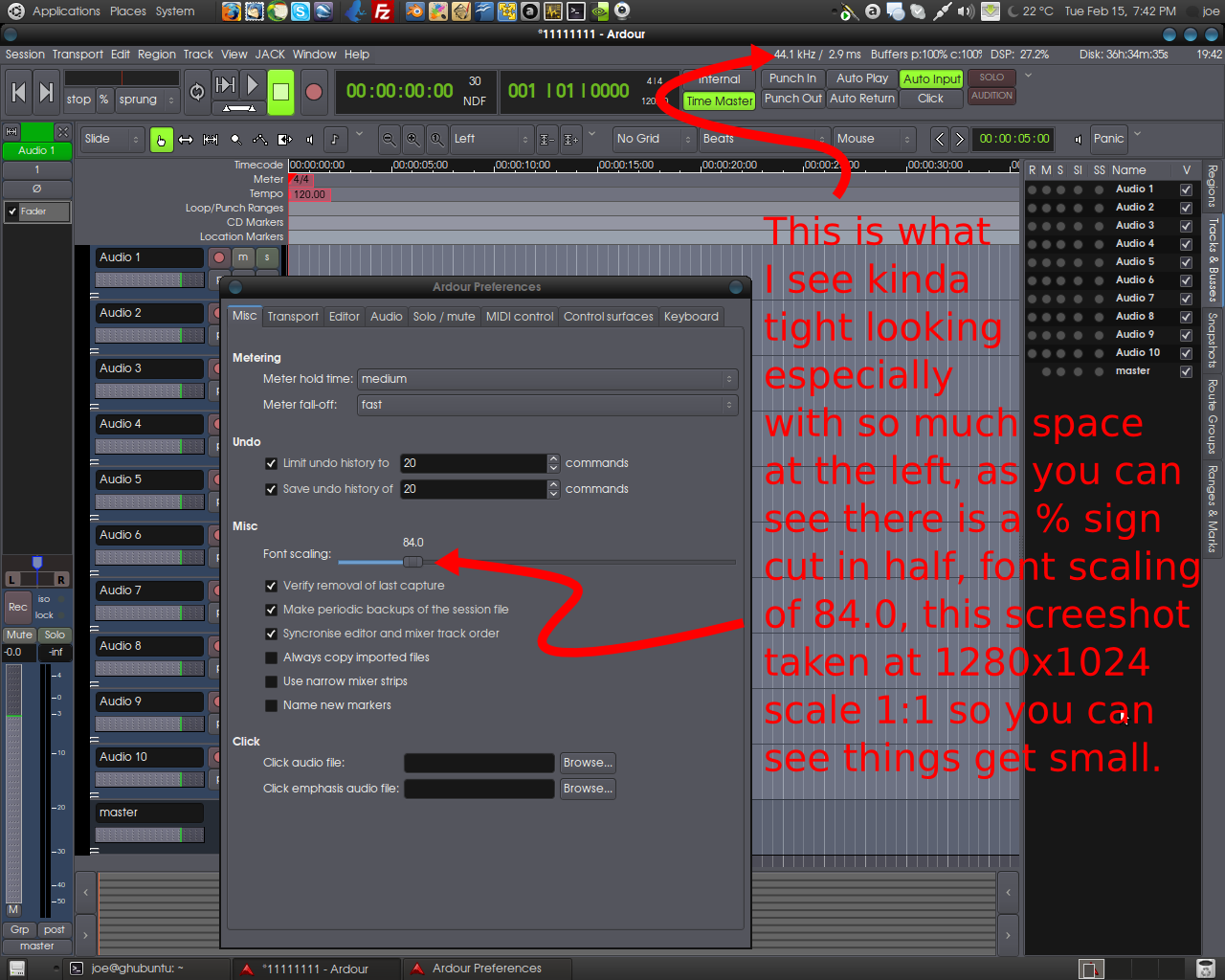 Yes, font scaling of 84% seems to fit things well but it sure looks kinda small to me, could be a bit hard to read for some people. On Ardour 2 I always use font scaling of 100% and all fits fine and clearly legible. |