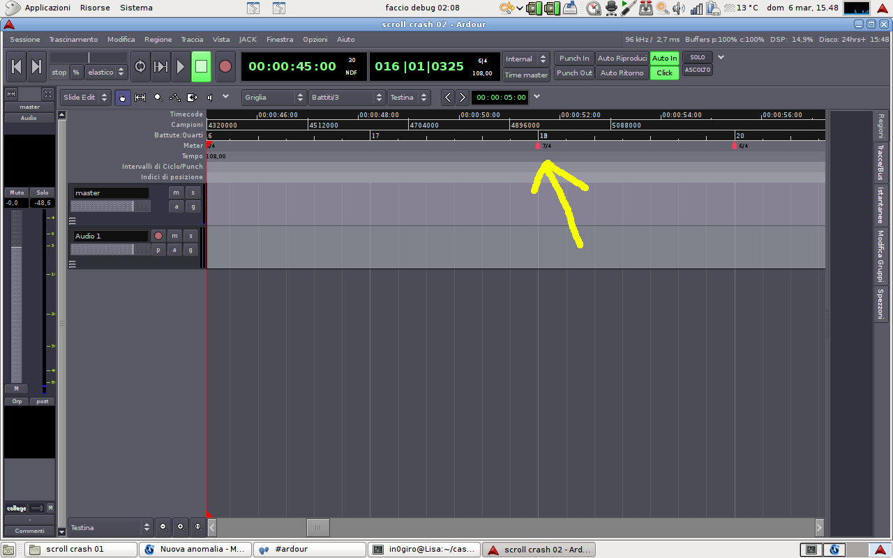 | Additional Information | *** session file *** <?xml version="1.0" encoding="UTF-8"?> <Session version="2.0.0" name="scroll crash 01" sample-rate="96000" id-counter="680"> <Config> <Option name="output-auto-connect" value="2"/> <Option name="input-auto-connect" value="1"/> <Option name="mtc-port-name" value="control"/> <Option name="mmc-port-name" value="control"/> <Option name="midi-port-name" value="control"/> <Option name="clicking" value="yes"/> <Option name="meter-falloff" value="32"/> <end-marker-is-free val="no"/> </Config> <Sources/> <Regions/> <DiskStreams> <AudioDiskstream flags="Recordable" channels="1" playlist="Audio 1.1" speed="1" name="Audio 1" id="173"/> </DiskStreams> <Locations> <Location id="17" name="start" start="0" end="0" flags="IsMark,IsStart" locked="no"/> <Location id="16" name="end" start="28800000" end="28800000" flags="IsMark,IsEnd" locked="no"/> <Location id="60" name="Ciclo" start="0" end="28800000" flags="IsAutoLoop,IsHidden" locked="no"/> <Location id="61" name="Punch" start="0" end="28800000" flags="IsAutoPunch,IsHidden" locked="no"/> <Location id="70" name="mark1" start="576000" end="576000" flags="IsMark" locked="no"/> <Location id="73" name="mark2" start="1216000" end="1216000" flags="IsMark" locked="no"/> </Locations> <Connections/> <Routes> <Route flags="MasterOut" default-type="audio" muted="no" soloed="no" phase-invert="no" denormal-protection="no" mute-affects-pre-fader="yes" mute-affects-post-fader="yes" mute-affects-control-outs="yes" mute-affects-main-outs="yes" meter-point="MeterPostFader" order-keys="editor=0:signal=0"> <IO name="master" id="18" active="yes" inputs="{Audio 1/out 1}{Audio 1/out 2}" outputs="{}" gain="1.000000000000" iolimits="-1,2,-1,2"> <Panner linked="no" link_direction="SameDirection" bypassed="no"/> <controllable name="gaincontrol" id="19"/> <Automation> <AutomationList id="20" default="1" min_yval="0" max_yval="2" max_xval="0" state="Off" style="Absolute"/> </Automation> </IO> <controllable name="solo" id="22"/> <controllable name="mute" id="23"/> <remote_control id="1"/> <extra> <GUI color="19868:15285:22061" shown_mixer="yes" height="62" shown_editor="yes"> <gain shown="no" height="62"/> <pan shown="no" height="62"/> </GUI> </extra> </Route> <Route default-type="audio" muted="no" soloed="no" phase-invert="no" denormal-protection="no" mute-affects-pre-fader="yes" mute-affects-post-fader="yes" mute-affects-control-outs="yes" mute-affects-main-outs="yes" meter-point="MeterPostFader" order-keys="editor=1:signal=1" mode="Normal" diskstream-id="173"> <IO name="Audio 1" id="166" active="yes" inputs="{}" outputs="{master/in 1}{master/in 2}" gain="1.000000000000" iolimits="1,-1,-1,-1"> <Panner linked="no" link_direction="SameDirection" bypassed="no"> <Output x="0" y="0"/> <Output x="1" y="0"/> <StreamPanner x="0" type="Equal Power Stereo" muted="no"> <Automation> <AutomationList id="193" default="0" min_yval="0" max_yval="1" max_xval="0" state="Off" style="Absolute"/> </Automation> <controllable name="panner" id="192"/> </StreamPanner> <StreamPanner x="1" type="Equal Power Stereo" muted="no"> <Automation> <AutomationList id="196" default="1" min_yval="0" max_yval="1" max_xval="0" state="Off" style="Absolute"/> </Automation> <controllable name="panner" id="195"/> </StreamPanner> </Panner> <controllable name="gaincontrol" id="167"/> <Automation> <AutomationList id="168" default="1" min_yval="0" max_yval="2" max_xval="0" state="Off" style="Absolute"/> </Automation> </IO> <controllable name="solo" id="170"/> <controllable name="mute" id="171"/> <remote_control id="2"/> <Insert type="ladspa" unique-id="4068" count="1"> <Redirect active="yes" placement="PreFader"> <IO name="guitarix" id="187" active="yes" inputs="" outputs="" gain="1.000000000000" iolimits="-1,-1,-1,-1"> <Panner linked="no" link_direction="SameDirection" bypassed="no"/> <controllable name="gaincontrol" id="188"/> <Automation> <Automation/> </Automation> </IO> <Automation visible=""/> </Redirect> <ladspa> <port number="3" value="+0.000000"/> <controllable name="balance" id="199"/> <port number="4" value="+0.000000"/> <controllable name="tone-bass" id="201"/> <port number="5" value="+0.000000"/> <controllable name="tone-treble" id="203"/> <port number="6" value="+0.000000"/> <controllable name="gain-in" id="205"/> <port number="7" value="+0.000000"/> <controllable name="gain-out" id="207"/> <port number="8" value="+0.000000"/> <controllable name="gain-preamp" id="209"/> <port number="9" value="+1.000000"/> <controllable name="distortion-drive" id="211"/> <port number="10" value="+1.000000"/> <controllable name="distortion-onoff" id="213"/> <port number="11" value="+0.000000"/> <controllable name="freeverb-roomsize" id="215"/> <port number="12" value="+0.000000"/> <controllable name="freeverb-onoff" id="217"/> <port number="13" value="+20.000000"/> <controllable name="ir-frequency" id="219"/> <port number="14" value="+4.175253"/> <controllable name="ir-peakgain" id="221"/> <port number="15" value="+1.000000"/> <controllable name="ir-onoff" id="223"/> <port number="16" value="+0.000000"/> <controllable name="crybaby-wah" id="225"/> <port number="17" value="+0.000000"/> <controllable name="crybaby-onoff" id="227"/> <port number="18" value="+60.000000"/> <controllable name="echo-release" id="229"/> <port number="19" value="+1000.000000"/> <controllable name="echo-time" id="231"/> <port number="20" value="+1.000000"/> <controllable name="echo-onoff" id="233"/> <port number="21" value="+0.000000"/> <controllable name="feedbackgain" id="235"/> <port number="22" value="+0.000000"/> <controllable name="feedforwardgain" id="237"/> </ladspa> <controls> <controllable name="balance" id="199" parameter="3"/> <controllable name="tone-bass" id="201" parameter="4"/> <controllable name="tone-treble" id="203" parameter="5"/> <controllable name="gain-in" id="205" parameter="6"/> <controllable name="gain-out" id="207" parameter="7"/> <controllable name="gain-preamp" id="209" parameter="8"