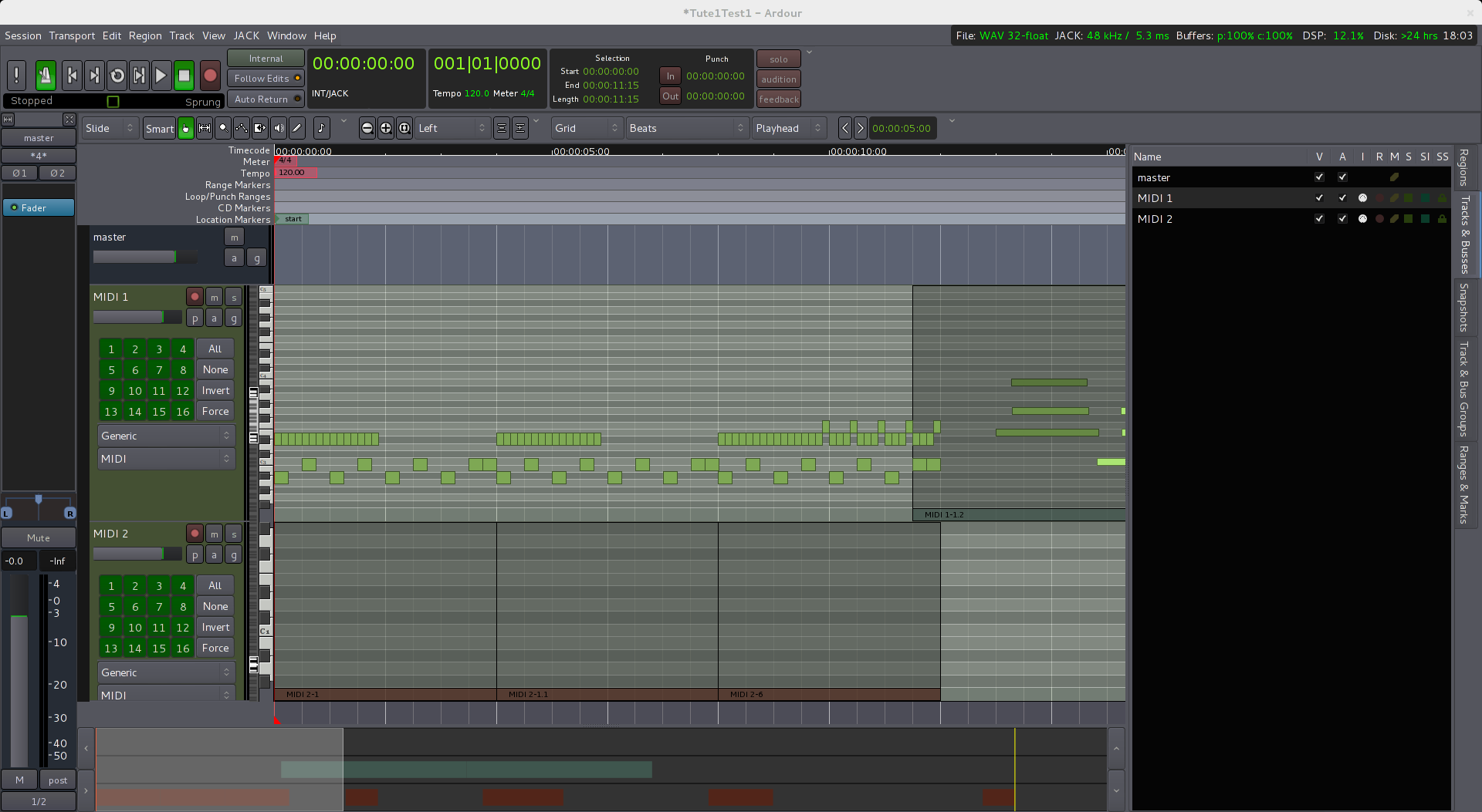 | Description | Steps to reproduce: * create two MIDI tracks, one above the other * in the lower MIDI track, create a region and add some notes * in the lower track, scroll the scroomer down, so that the notes within that region are "behind" the MIDI track above * toggle the MIDI channel for those notes off and on. The notes, which should not be visible, are rendered over the top of the upper MIDI track I've attached a screenshot which demonstrates this: MIDI notes entered in to regions on track "MIDI 2" are visible on top of track "MIDI 1" after scrolling the scroomer down and toggling channel 1 on track "MIDI 2" on and off | ||||
