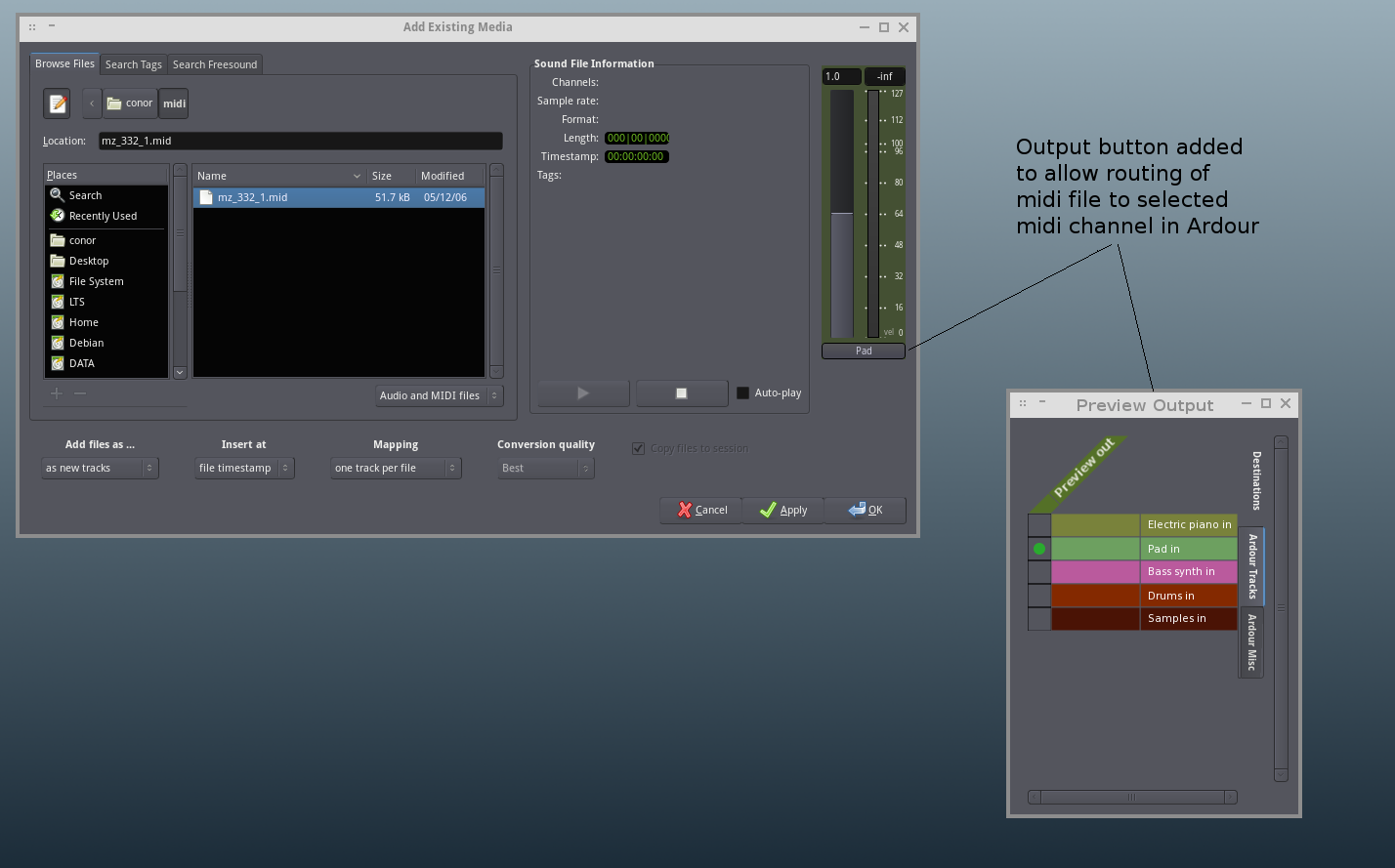 | Description | It's great being able to preview audio before importing it to your session. It would be great if you could also do the same with midi files. Would it be possible, when midi files are selected, to add an output button in the import dialog from where you could route it to a midi channel within Ardour? This would allow you to preview the file through whatever synth, sampler, etc, you already have set up on the track that you intent to import the file to. | ||||