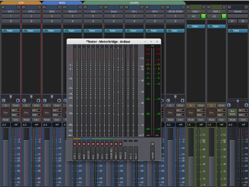 Thanks x42 for answering those questions. I seem to have missed those options in the meterbridge tab and I can understand what you're saying about window resizing. Another thought while I was using the meterbridge was in regards to groups and track types. There's no indication as to which meters belong to active groups. Same goes for tracks, there's no distinction between audio, midi and bus tracks. Could additional coloured boxes/lines work to indicate these so that it's easier/quicker to distinguish which tracks are which? I've attached a mock up of what I’m trying to explain. |