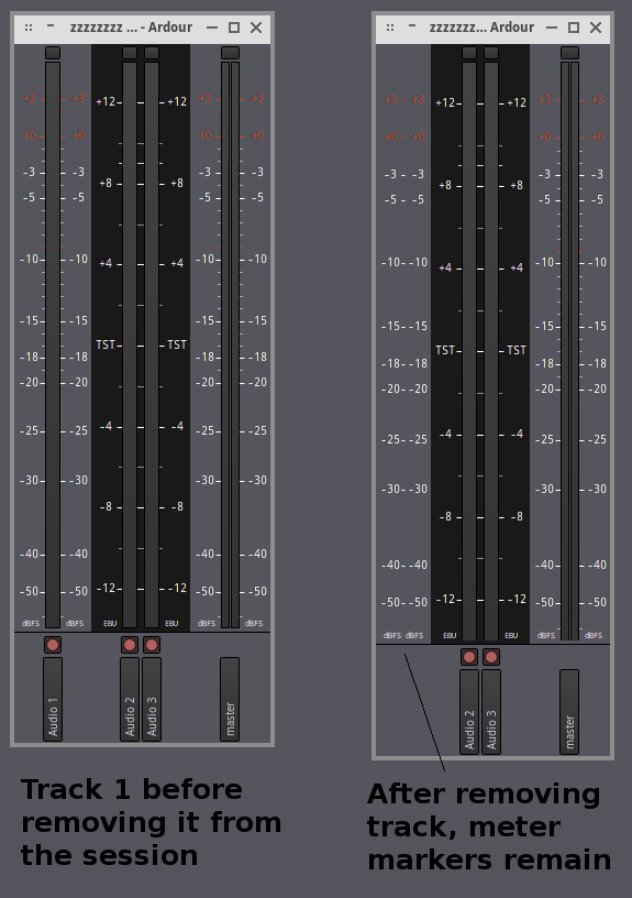 I've just noticed a little something else with the meterbridge. Sometimes after removing a track that is beside other tracks that are using different meter types, the meter markers from the removed track remain. I've attached an image of how this looks. Here's how I replicated it - Add 3 audio tracks Open meterbridge Change track 2 and 3 to the same meter type Delete track 1 See result in screenshot attached I am not sure if it happens in other scenarios but it seems to consistently happen when it's the first track that is removed and if it is beside tracks using a different meter type. Another observation is that it seem to only happen when there are multiple tracks to the right that share the same meter type, hence why I say to add 3 tracks to replicate the issue. Adding 2 tracks will not replicate this. Closing and reopening the meterbridge doesn't resolve the issue however, adding more tracks to the session removes the markers left by the deleted track. |
