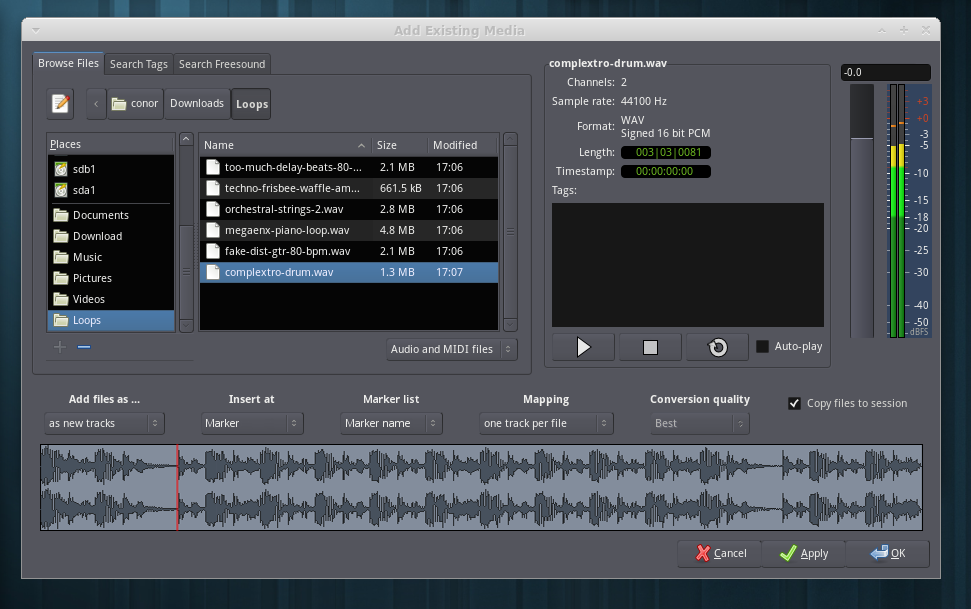 | Description | 3 main ideas, mock up included - 1. Waveform preview - Jump playhead to any point in waveform preview, just like in edit window. 2. Add loop button 3. Import to markers facility - The idea here would be to add a 5th option in the "insert at" drop down menu called "marker" or "marker location". A drop down "marker list" would be available to the right with all of the sessions markers. Putting them in a second list would avoid cluttering up the "insert at" menu and keep it out of the way, unless you wanted to use it. The "marker list" menu would be greyed out, unless you select "marker" from the "insert at" list, simliar to how "insert at" is greyed out if you choose to add files to region list. | ||||