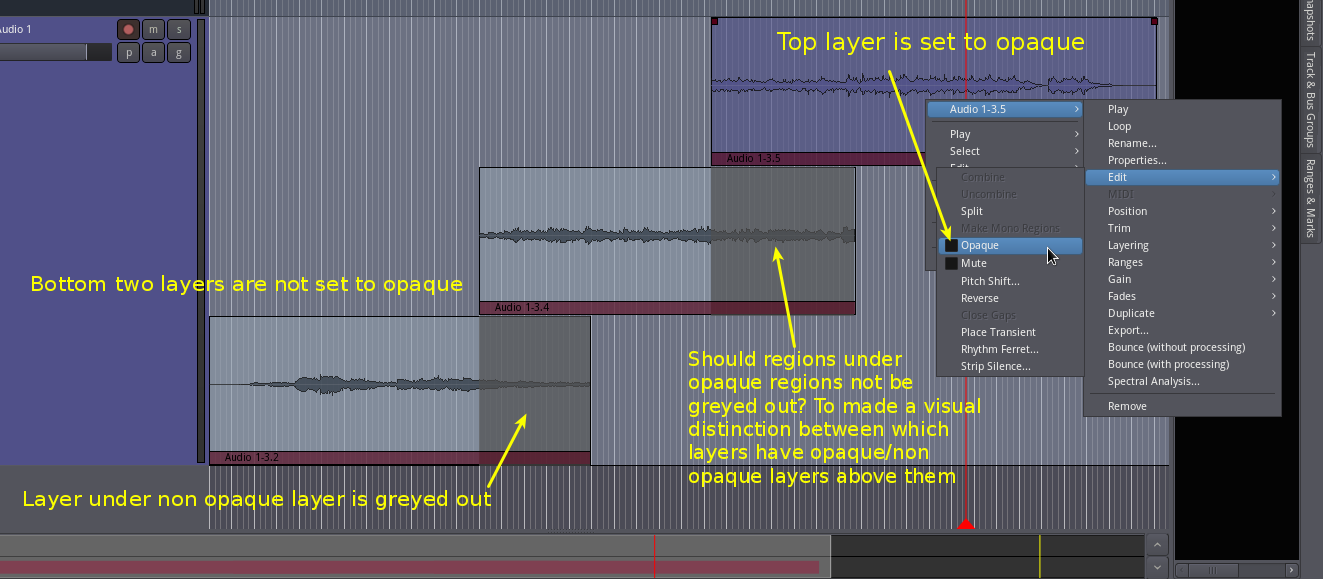 | Description | If you are working with opaque and non opaque layers, particularly in stacked mode, there are two things that I believe can make the workflow confusing. Greyed out region areas and the fact that there is no way of telling opaque and non opaque layers apart. In stacked mode, regions are always greyed out by the region above them. This can be confusing as it could give the user the impression that all top layers block out audio from the layers below them, yet this isn't the case if the top layer is opaque. Also, the lack of the visual distinction between these two modes, opaque and non opaque, can be confusing as you might lose track in a large session of which layers are set to opaque and which aren't. I understand that greyed out areas aren't always blocked out as you can apply fades to above layers and these will apply opposite fades on the layers below. Taking that into account, maybe it would be better to just give a distinction to regions that are set to opaque and retain the greyed out areas? This would allow you to, at a glance, know which layers are opaque and which aren't, so you can more quickly work with your regions. Also, should the opaque box be unticked by default if regions/layers are not opaque by default. Seems the wrong way around. It gives the impression that they are already opaque. | ||||