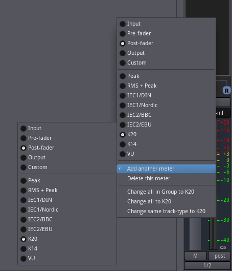 | Description | Sometimes it's useful to have two meters to reference against each other. An option like this would be very useful to have for the master out. It would also allow you to monitor different points on the master channel using more than one meter. How would it work? One idea would be that right clicking on the existing meter would include a submenu where you could enable an extra meter. There could also be an option to delete meters from this menu. | ||||