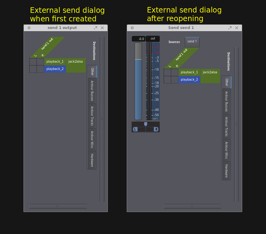 | Description | When you create an external send, the send window initially shows up without fader and pan controls. If you close the send dialog window and reopen it, the controls then show up. | ||||