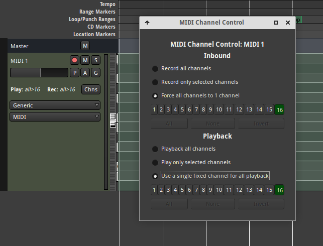 | Description | Editing MIDI channels resizes track header and cuts off piano roll, until track header is resized. Steps to reproduce - - Create a MIDI track and expand its height - Click on the 'Chns' button - Choose 'Force all channels to 1 channel' and select a double digit numbered channel - Choose 'Use a single fixed channel for all playback' and again select a double digit numbered channel The added width of the double digit numbers (or inclusion of a digit where there previously wasn't one) is the cause of this. This appears to only be an issue with Ardour 4 onwards. | ||||
