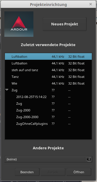 | Additional Information | The "Zug.ardour" file looks like this: <?xml version="1.0" encoding="UTF-8"?> <Session version="3001" name="Zug" sample-rate="44100" id-counter="414334" event-counter="0"> <MIDIPorts> <Port name="MIDI Clock in" direction="input"/> <Port name="MIDI Clock out" direction="output"/> <Port name="MIDI control in" direction="input"/> <Port name="MIDI control out" direction="output"/> <Port name="MMC in" direction="input"/> <Port name="MMC out" direction="output"/> <Port name="MTC in" direction="input"/> <Port name="MTC out" direction="output"/> <Port name="Scene in" direction="input"/> <Port name="Scene out" direction="output"/> </MIDIPorts> <Config> <Option name="destructive-xfade-msecs" value="2"/> <Option name="use-region-fades" value="1"/> <Option name="show-region-fades" value="1"/> <Option name="native-file-data-format" value="0"/> <Option name="native-file-header-format" value="1"/> <Option name="auto-play" value="0"/> <Option name="auto-return" value="0"/> <Option name="auto-input" value="0"/> <Option name="punch-in" value="0"/> <Option name="punch-out" value="0"/> <Option name="subframes-per-frame" value="100"/> <Option name="timecode-format" value="8"/> <Option name="raid-path" value=""/> <Option name="audio-search-path" value=""/> <Option name="midi-search-path" value=""/> <Option name="track-name-number" value="0"/> <Option name="track-name-take" value="0"/> <Option name="take-name" value="Take1"/> <Option name="jack-time-master" value="0"/> <Option name="use-video-sync" value="0"/> <Option name="video-pullup" value="0"/> <Option name="show-summary" value="1"/> <Option name="show-group-tabs" value="1"/> <Option name="external-sync" value="0"/> <Option name="insert-merge-policy" value="1"/> <Option name="timecode-offset" value="0"/> <Option name="timecode-offset-negative" value="1"/> <Option name="slave-timecode-offset" value=" 00:00:00:00"/> <Option name="timecode-generator-offset" value=" 00:00:00:00"/> <Option name="glue-new-markers-to-bars-and-beats" value="0"/> <Option name="midi-copy-is-fork" value="0"/> <Option name="glue-new-regions-to-bars-and-beats" value="0"/> <Option name="use-video-file-fps" value="0"/> <Option name="videotimeline-pullup" value="1"/> <Option name="show-busses-on-meterbridge" value="0"/> <Option name="show-master-on-meterbridge" value="1"/> <Option name="show-midi-on-meterbridge" value="1"/> <Option name="show-rec-on-meterbridge" value="1"/> <Option name="show-mute-on-meterbridge" value="0"/> <Option name="show-solo-on-meterbridge" value="0"/> <Option name="show-monitor-on-meterbridge" value="0"/> <Option name="show-name-on-meterbridge" value="1"/> <Option name="meterbridge-label-height" value="2"/> </Config> <Metadata/> <Sources> <Source name="Audio 1-1.wav" type="audio" flags="" id="921" captured-for="Audio 1" channel="0" origin=""/> <Source name="Audio 2-1.wav" type="audio" flags="" id="3500" captured-for="Audio 2" channel="0" origin=""/> <Source name="Audio 1-13.wav" type="audio" flags="" id="3651" captured-for="Audio 1" channel="0" origin=""/> .... and so on. | ||||