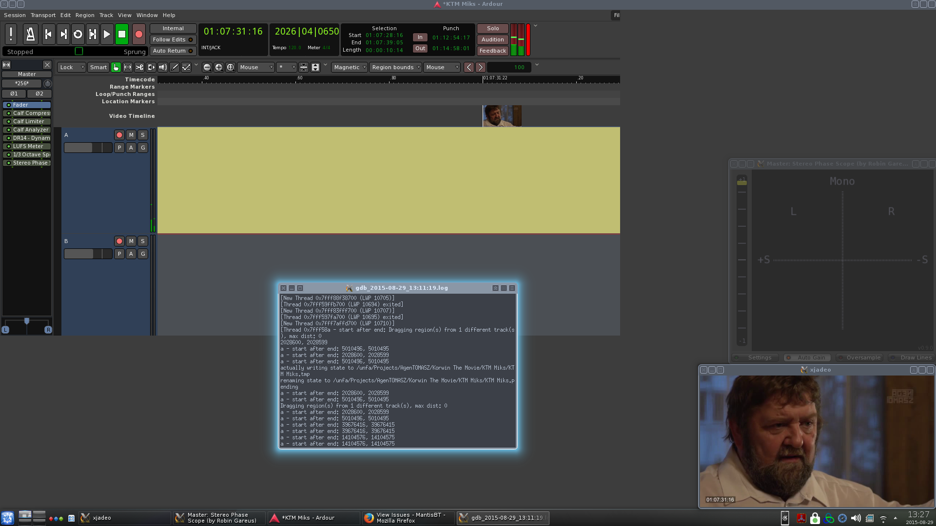| Description | I installed debug build to catch this bug, now that it happened I didn't see anything in GDB. IT seemed that Ardour is working fine, but it just suddenly stopped refreshing it's window and stopped reacting to user input. I pressed Ctrl+C to force-quit, then I got a backtrace in GDB. Afterwards I used 'thread apply all bt' in GDB to get more info. GDB log with all threads backtraces: http://pastebin.com/ucgHq718 I've cut out some redundant logs of threads starting and ending leaving (...) marks. The log was huge with that left in. | ||||