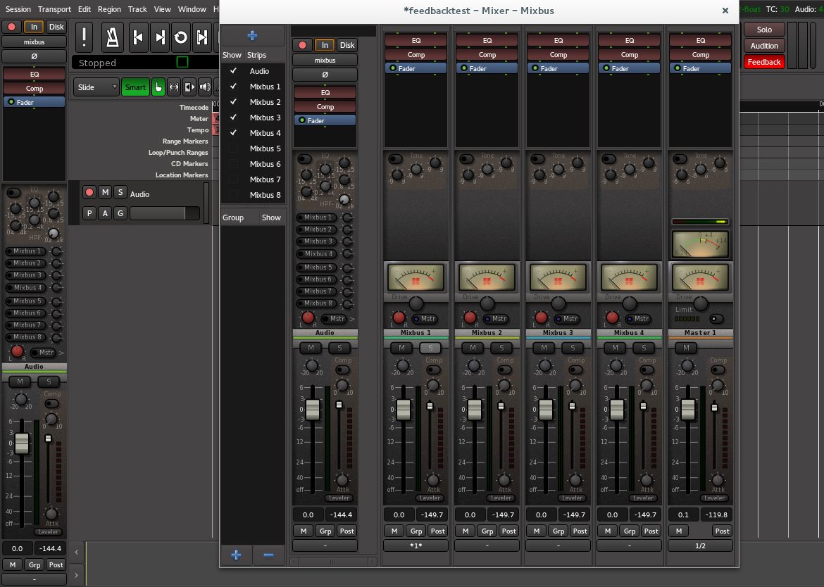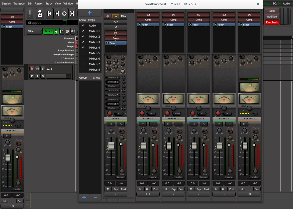 | Description | Mixbus 3.0.2192 Linux Open a new session Create an empty track Disable the feed to the master bus and any mixbuses Disconnect the input Route the output of mixbus 1 to the input of the track. Note the feedback light will come on, even though there is no feedback in this case. (see screenshot 1) At this point you can record the output of mixbus 1 if desired. Save the session and quit Reopen the session. Note that the feedback indicator is still on AND all the gain reduction meters and limiter meters are pegged on the mixbuses and master bus. (see screenshot 2) Disconnect mixbus 1 out from the track input and the meters will go back to normal. | ||||