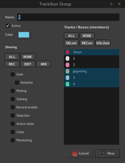 | Description | when using groups, it would be nice to have some advanced group settings: when adding new group, "create new group from" menu entry should be replaced by a list of tracks/busses in "track/bus group" creation window, from which you can chose freely by selecting in a list, and also by buttons to select multiple like: from selection, record enabled, soloed, all, none same should apply to group "sharing" selection, where buttons like all, none (none should be the default), rec, mix, edit (which could contain preset selection of sharing) would help to speed up setting of groups another issue is, there is no possibility to add one track/bus to more groups at the same time, as upon creating a new group, a member which is already in other group is removed from its former group if somebody has similar "issues" with setting up the groups, please comment | ||||