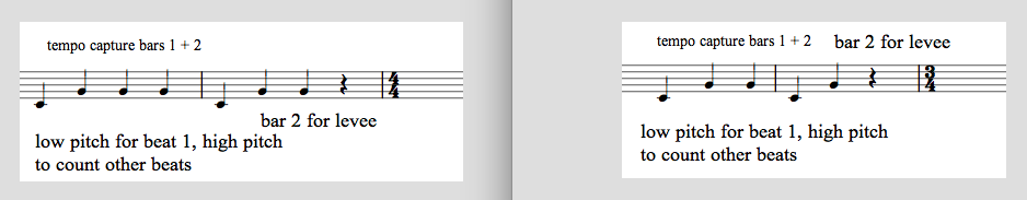 | Description | hi, a little idea for the tempo capture : at the point where the tempo has to be edited: just play 2 bars as on picture, your tool calculates , and the right tempo + time signature is « placed « :) | ||||