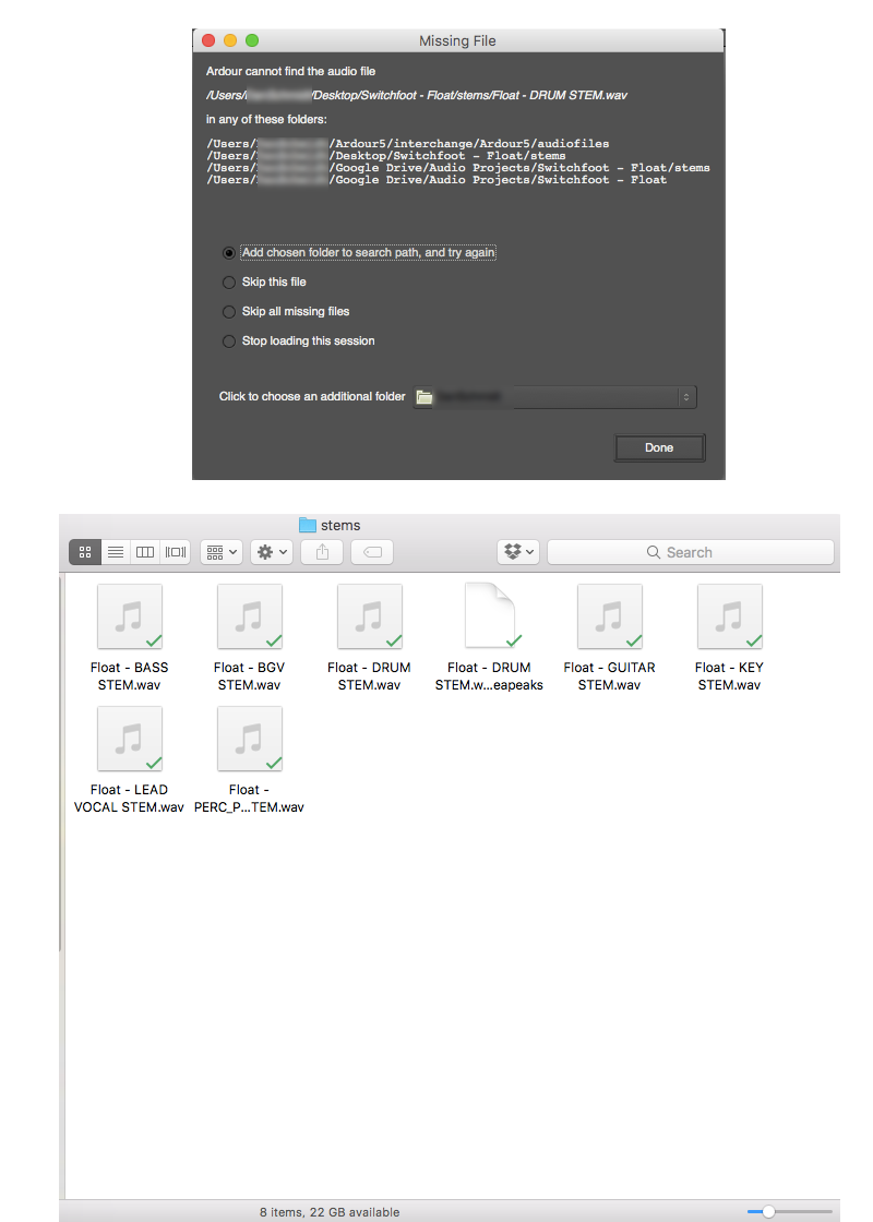 | Description | I have a project with some audio samples that got moved. I told Ardour where they were, but it still tells me they aren't there. See photos below with the paths it is said to have checked. | ||||