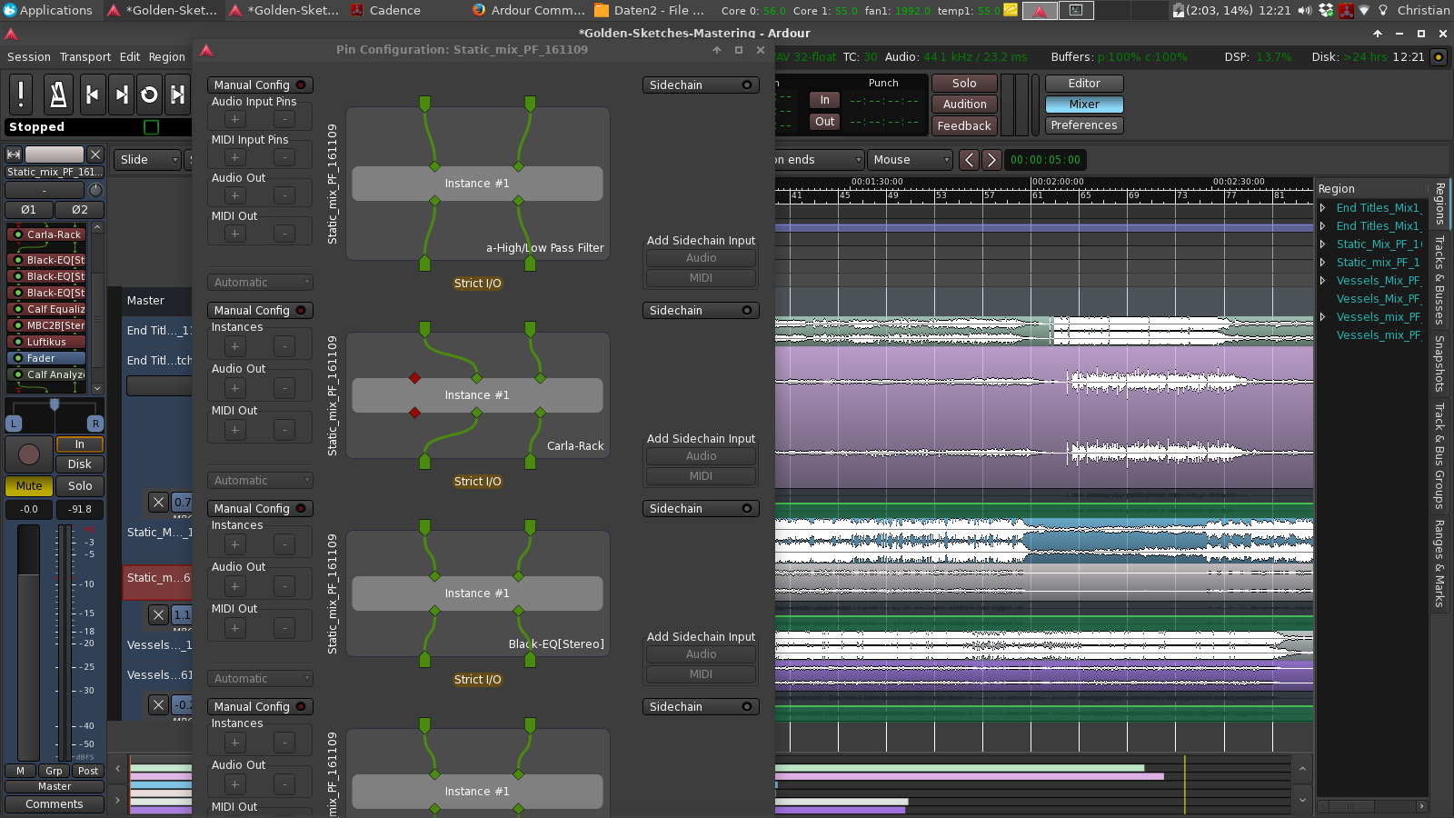 | Description | You have a track with for instance 4 or more plugins (depending on your display resolution, here it's 1600 x 900). When open the tracks pin configuration dialouge some connections won't be adjustable because they are cut off at the bottom of the screen. You have to press Alt key and left mouse key to move the window upwards. It would be better having a scroll bar. using Ardour 5.5 from ardour.org | ||||