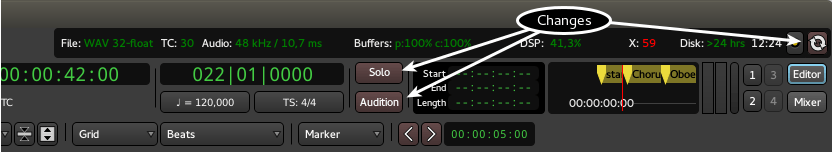 Well, the Solo and Audition function as buttons to reset solo state globally and stop auditioning, so they are not purely for notifications. I've also added a mockup but it requires a feature that doesn't exist yet and it does take up more horizontal space in the toolbar. |