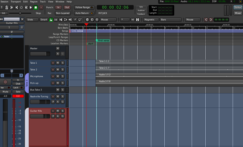 Unfortunately no change with 6.0-pre1-167-geeb62c99fb. The recipe to create the issue for me: - Add a new track to a fresh session - Add the new Ardour NoiseGen, crank the generator output to max - Move the channel fader all up - now the channel meter peaks red - Disable the generator, wait for the meter reading dropping well below 0 dB - Click the 'Click to reset' field of the channel meter. Maybe about 50% of the time it works: - the meter background reverts to gray - the indicated signal immediately falls to 'nothing - the reading is ''-inf'. In the other half of cases, - the signal also falls to 'nothing' immediately after the click - the meter very briefly 'blinks' and then is red again (I think it does revert to gray for a short moment) - the reading is '5.5' (after trying, I think it is always 5.5) If it failed to reset properly, the second click always seems to succeed. |