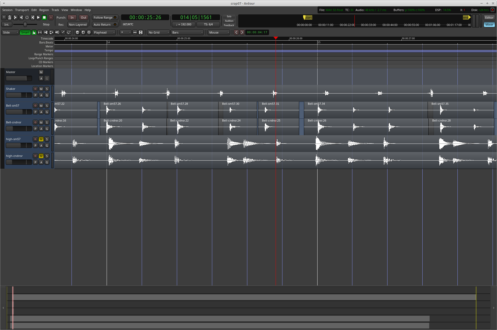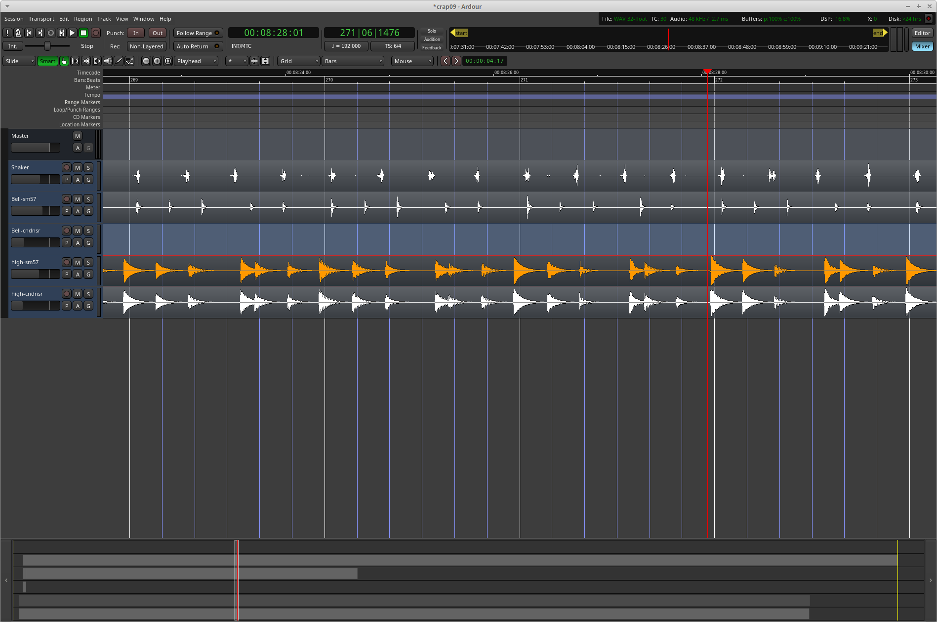 | Description | I have recorded a few tracks of hand drumming and am trying to improve the timing. So I am selecting several bars and then doing detailed edits to move individual notes to their correct position. Doing this by cutting and dragging. Once I have a decent set of several bars, I am combining regions and then building up a longer track (say 20mins) by repeatedly copy-pasting the section to the end and then combining the two regions, thus doubling the length each time. I find I get a corruption and the waveforms start showing glitches. For example the only difference between pics 1 and 2 is that I am selecting either track bell-sm57 or high-sm57. Similarly the only difference between pics 3 and 4 is that no.4 is one more level zoomed in. This was happening on my Dell laptop so I've also tried on my desktop with lots of memory but the same is happening. I also found that trying to clean up the projects caused Ardour to hang. I tried to find out when the problem was creeping in. I did a number of "save as" ops as I progressed with the editing, typically quitting Ardour fully in case of say some internal error. It seems the problem starts after combining regions but take this with a pinch of salt. Pic 5 shows where I've re-timed the bell pattern and this project doesn't seem to have the problem. But the next save-as with the regions combined does show the problem. I could try to upload the projects if anyone is able to look at them. I've selected "always" reproducible above though I haven't tried lots of different projects. Also I'm a relative novice and only occasional user with Ardour. | ||||