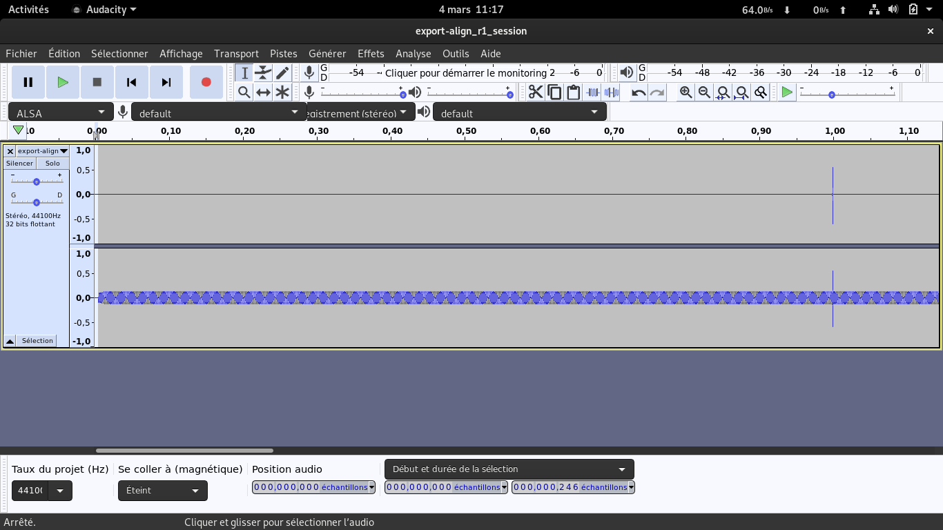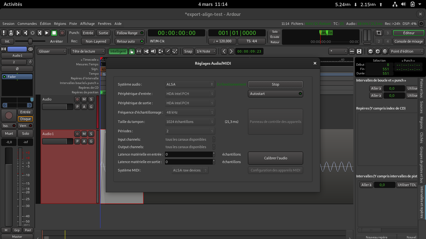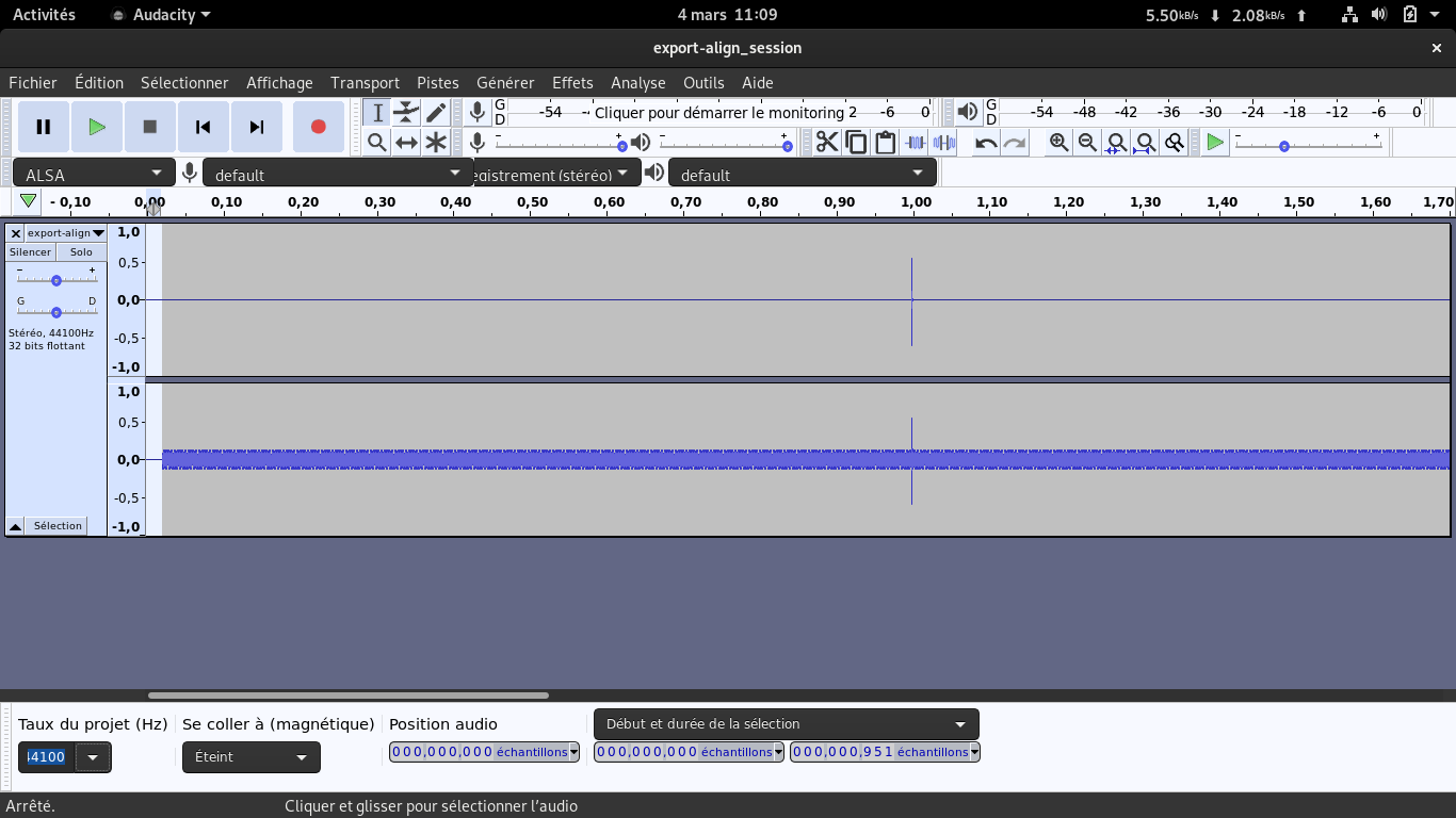 As you can see on the screenshot, the spike is perfectly at 1s, but the first 951 samples are 0. Attached also the audio config (if i am wrong somewhere). |