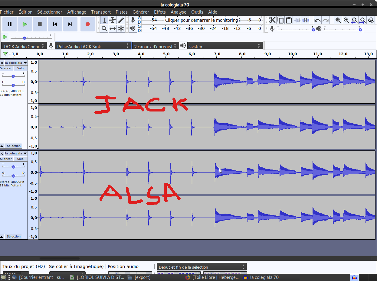 I've got this with alsa : https://imgur.com/a/r9u7wBv Right now, the attached file with pre0.3574 alsa and 1024 smple/buffers It don't seem an offset but 0 instead of the signal. |
