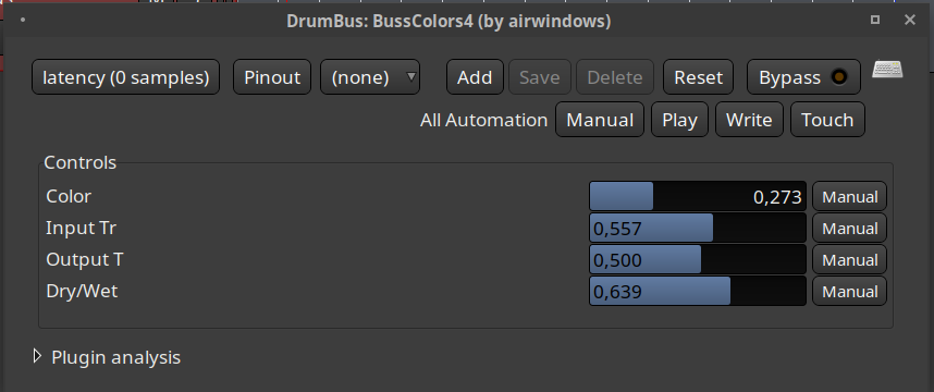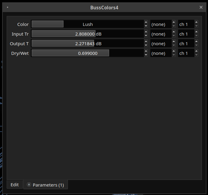| Steps To Reproduce | Open airwindows busscolor4 generic gui from both Carla and Ardour and note the top parameter. in Ardour, value between 0.000 and 1.000 In Carla, Dark, Rock, Lush,Vibe, Holo, Punch, Steel and Tube (Representing different Mixing Console characteristics like API, SSL and so on) | ||||