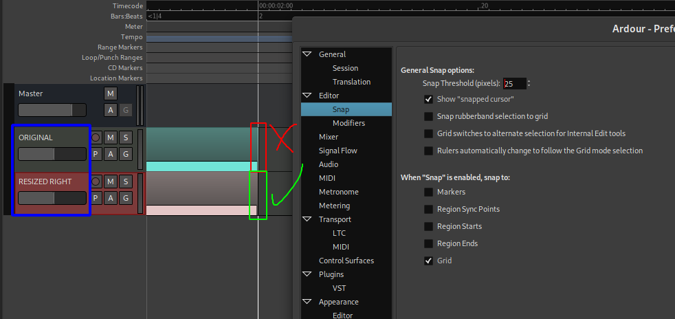 | Additional Information | Ardour compiled from master as of April 3th 2020, commit a6d1890 Default waf configurations I'm not using Smart mode, I do use Snap mode when doing this. "Snap to" option only checked GRID option, all other are disabled There's one interesting bit and that's when you zoom in really close to the end of the region and try to resize it, on all Edit modes as far as I can tell two things can happen: 1. The region ending will be snapped to the right place on any position of your mouse within the Pixel Snap Threshold option 2. The region ending will be either kept the same if the mouse is to the opposite side of the misalignment or correctly aligned if on the side of the misalignment (see video) Another thing is that when you select a few tracks that have this problems in variations of the original problem (i.e. misaligned differently), and duplicate them a bunch of times you eventually end up with the image attached here. Another strange thing is that the start of the regions seems like aligned every time on creation but not always when resizing (can't completely reproduce though). But whenever you align the tracks perfectly and duplicate them a lot of times they are perfectly aligned as they should be. After all this explanation, here's a demo video of the issue happening locally: https://www.youtube.com/watch?v=l2jabAAnzTU [ CPU couldn't handle 720p without everything dying, sorry but the problem can be seen clearly AFAIK ] I really don't know if this is everything about it it's such an strange issue but welp, here goes nothing :) | ||||