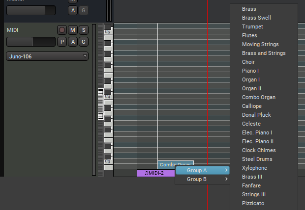| Steps To Reproduce | 1. create MIDI track without Instrument 2. Select "External MIDI Device" as "Roland/Juno-106" 3. Draw new MIDI Region, insert "Patch Change" on this 4. Select anything 5. Choose "Edit Mode" 6. right-click on the patch name to view the "submenu" with patches corresponding to the selected Device 7. Select "External MIDI Device" as "Yamaha/DX-7" 6. right-click on the patch name ... submenu not changed and correspond Juno 7. scroll wheel on patch name 8. right-click on the patch name ... all ok | ||||