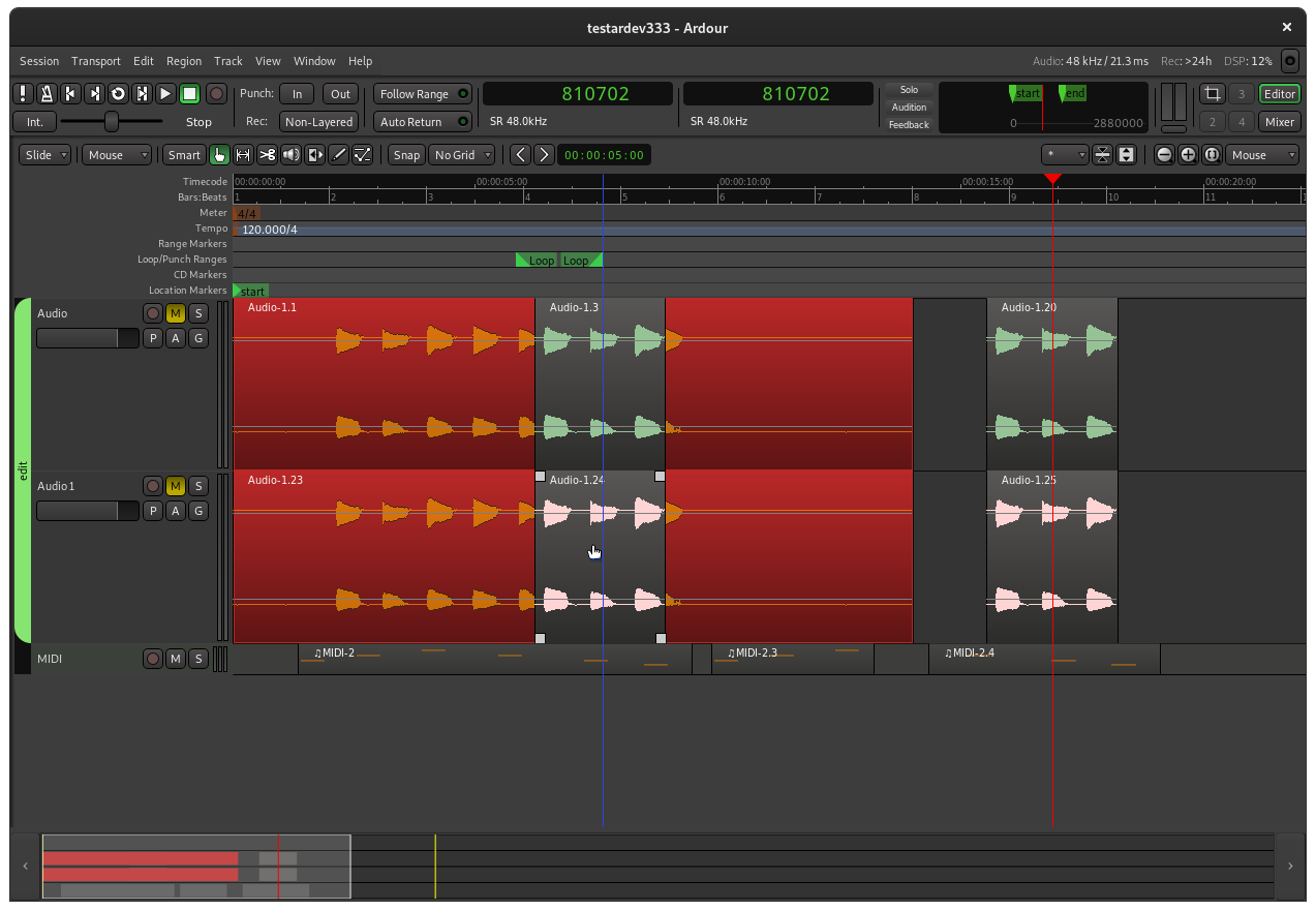 | Description | The 's' keyboard shortcut when used with Mouse as edit point now splits the topmost region rather than the selected region. This is a behaviour change from Ardour-5. The selected region is split when Playhead is used as the edit point. | ||||