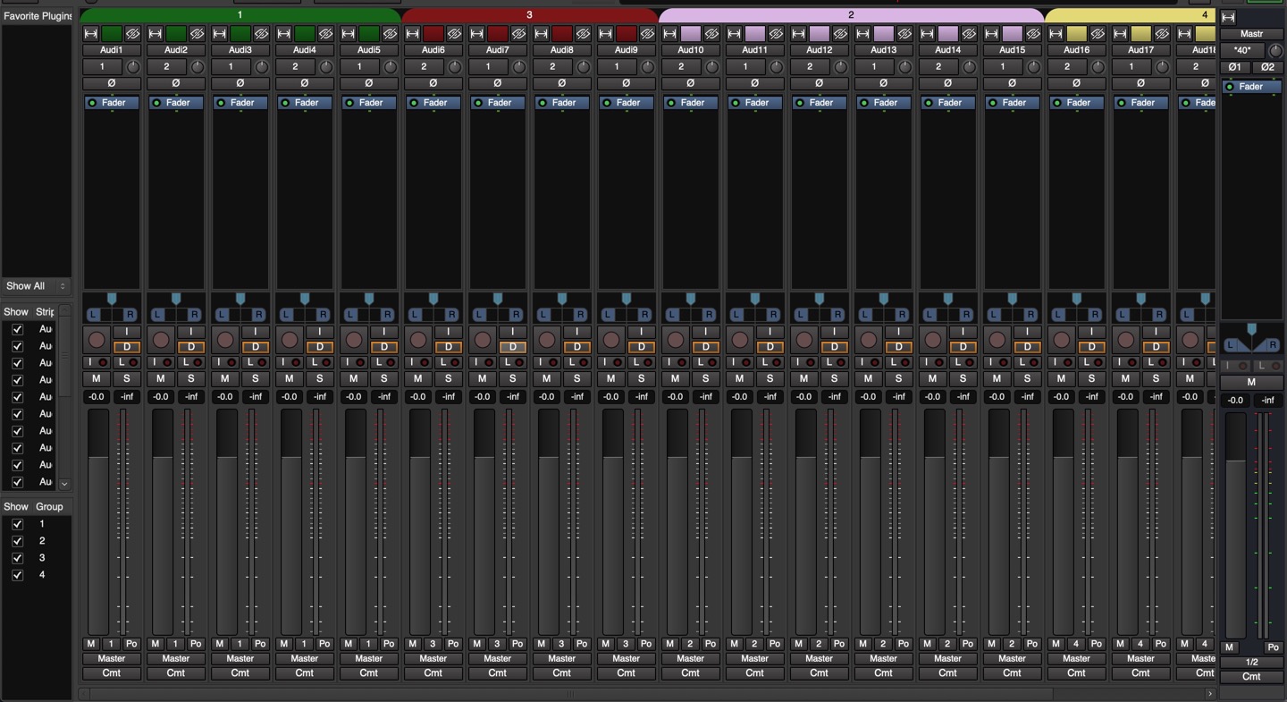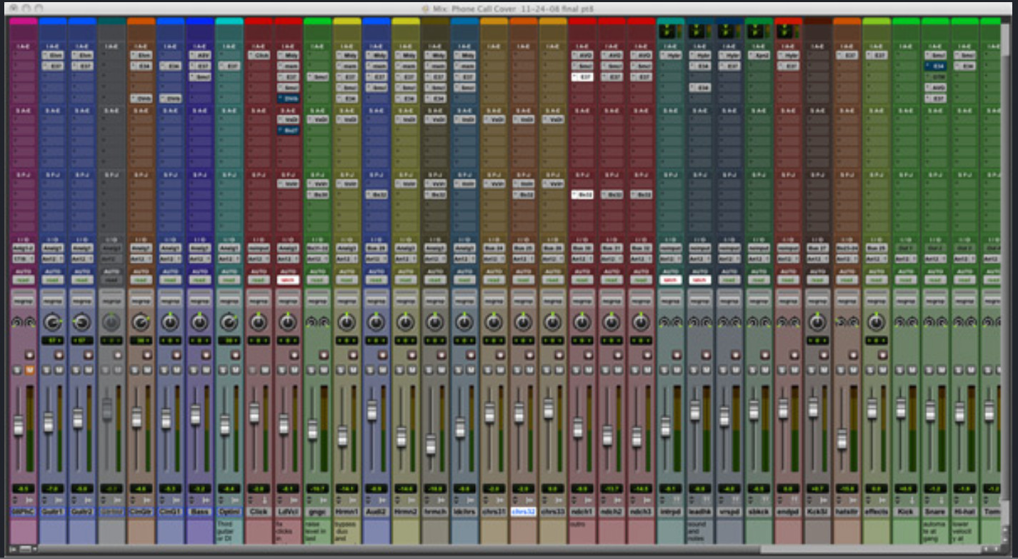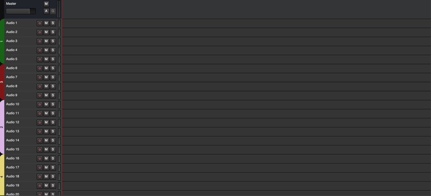 Plain old Protools has this appearance which is quite handy if you are looking for one of the two dark green tracks and are in a hurry. |